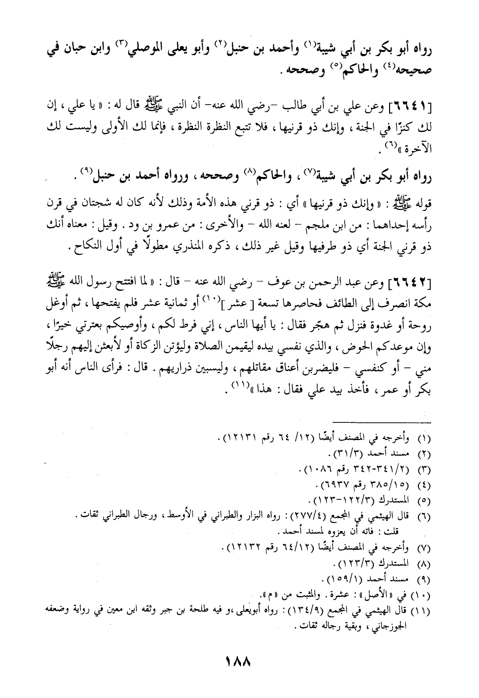 رَوَاهُ أَبُو بَكْرِ بْنُ أَبِي شَيْبَةَ وَأَحْمَدُ بْنُ حَنْبَلٍ وَأَبُو يَعْلَى الْمَوْصِلِيُّ وَابْنُ حِبَّانَ فِي صَحِيحِهِ وا لحا كم وَصَحَّحَهُ.
