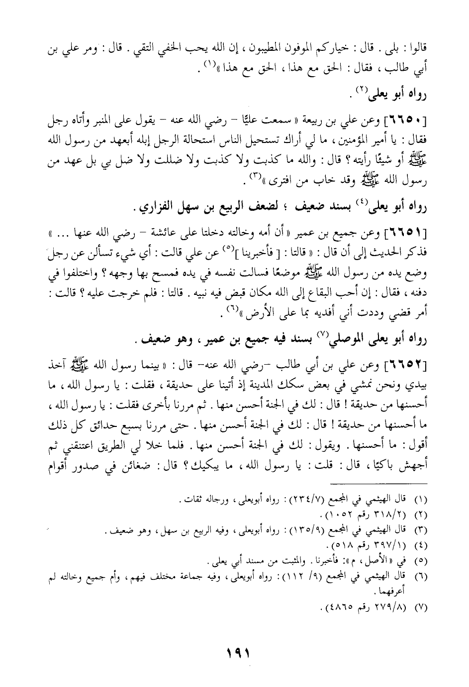 رَوَاهُ أَبُو يَعْلَى الْمَوْصِلِيُّ بِسَنَدٍ فِيهِ جُمَيْعُ بْنُ عمير وهو ضعيف.