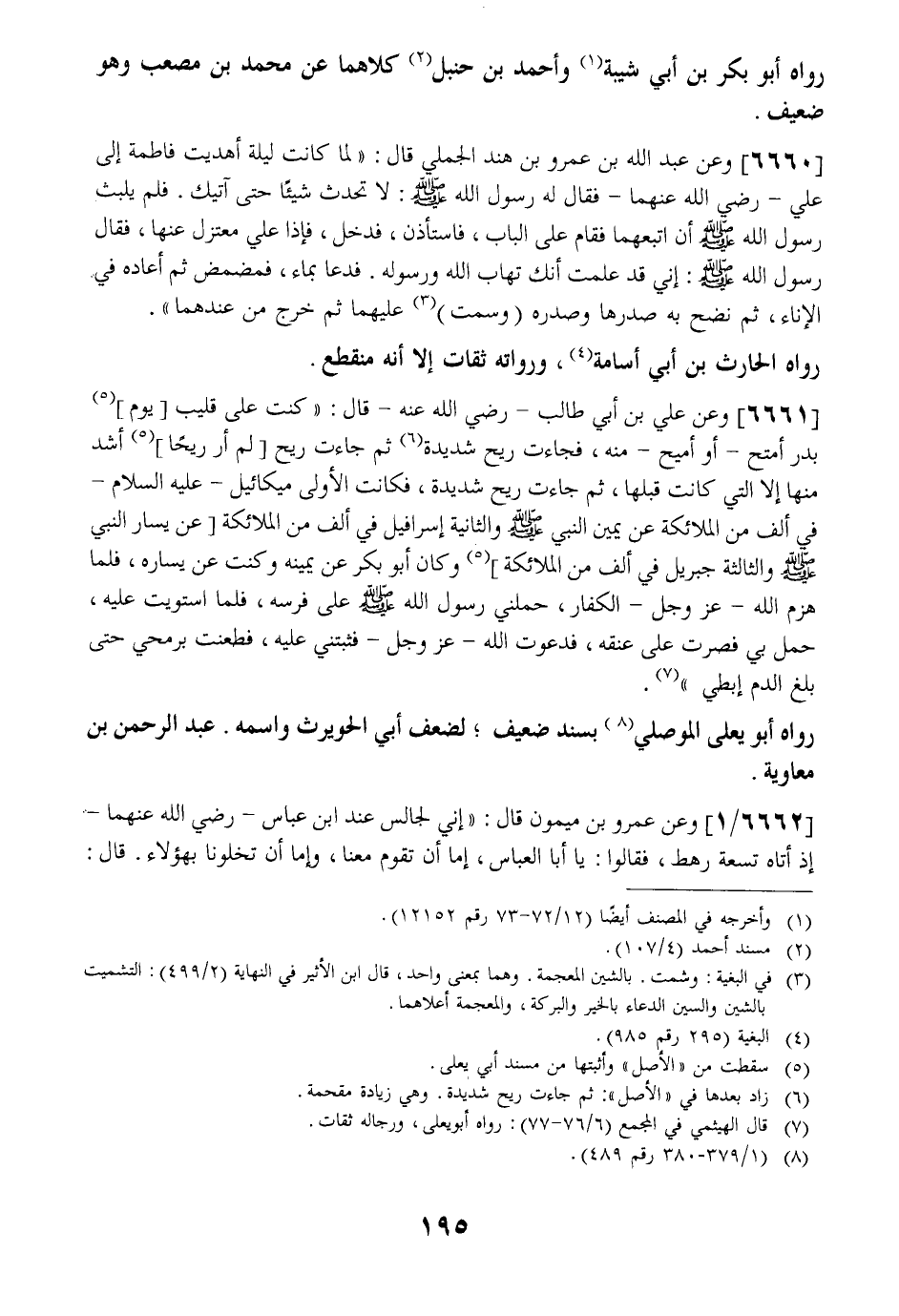 6661 - وَعَنْ عَلِيِّ بْنِ أَبِي طَالِبٍ- رَضِيَ اللَّهُ عَنْهُ- قال: " كنت على قليب يوم بدر أمتح- أو أميح- مِنْهُ فَجَاءَتْ رِيحٌ شَدِيدَةٌ ثُمَّ جَاءَتْ رِيحٌ لَمْ أَرَ رِيحًا أَشَدَّ مِنْهَا إِلَّا الَّتِي كَانَتْ قَبْلَهَا ثُمَّ جَاءَتْ رِيحٌ شَدِيدَةٌ فَكَانَتِ الْأُولَى مِيكَائِيلُ- عَلَيْهِ السَّلَامُ - فِي أَلْفٍ مِنَ الْمَلَائِكَةِ عَنْ يَمِينِ النَّبِيِّ - صَلَّى اللَّهُ عَلَيْهِ وَسَلَّمَ - وَالثَّانِيَةُ إِسْرَافِيلَ فِي أَلْفٍ مِنَ الْمَلَائِكَةِ عَنْ يَسَارِ النَّبِيِّ - صَلَّى اللَّهُ عَلَيْهِ وَسَلَّمَ - وَالثَّالِثَةُ جِبْرِيلَ فِي أَلْفٍ مِنَ الْمَلَائِكَةِ وَكَانَ أَبُو بَكْرٍ عَنْ يَمِينِهِ وَكُنْتُ عَنْ يَسَارِهِ فَلَمَّا هَزَمَ اللَّهُ- عَزَّ وَجَلَّ- الْكُفَّارَ حَمَلَنِي رَسُولُ اللَّهِ - صَلَّى اللَّهُ عَلَيْهِ وَسَلَّمَ - عَلَى فَرَسِهِ فَلَمَّا استويت عليه حمل بي فصرت على عنقه فدعوت الله- عز وجل- فَثَبَّتَنِي عَلَيْهِ فَطَعَنْتُ بِرُمْحِي حَتَّى بَلَغَ الدَّمُ إِبِطِي ".