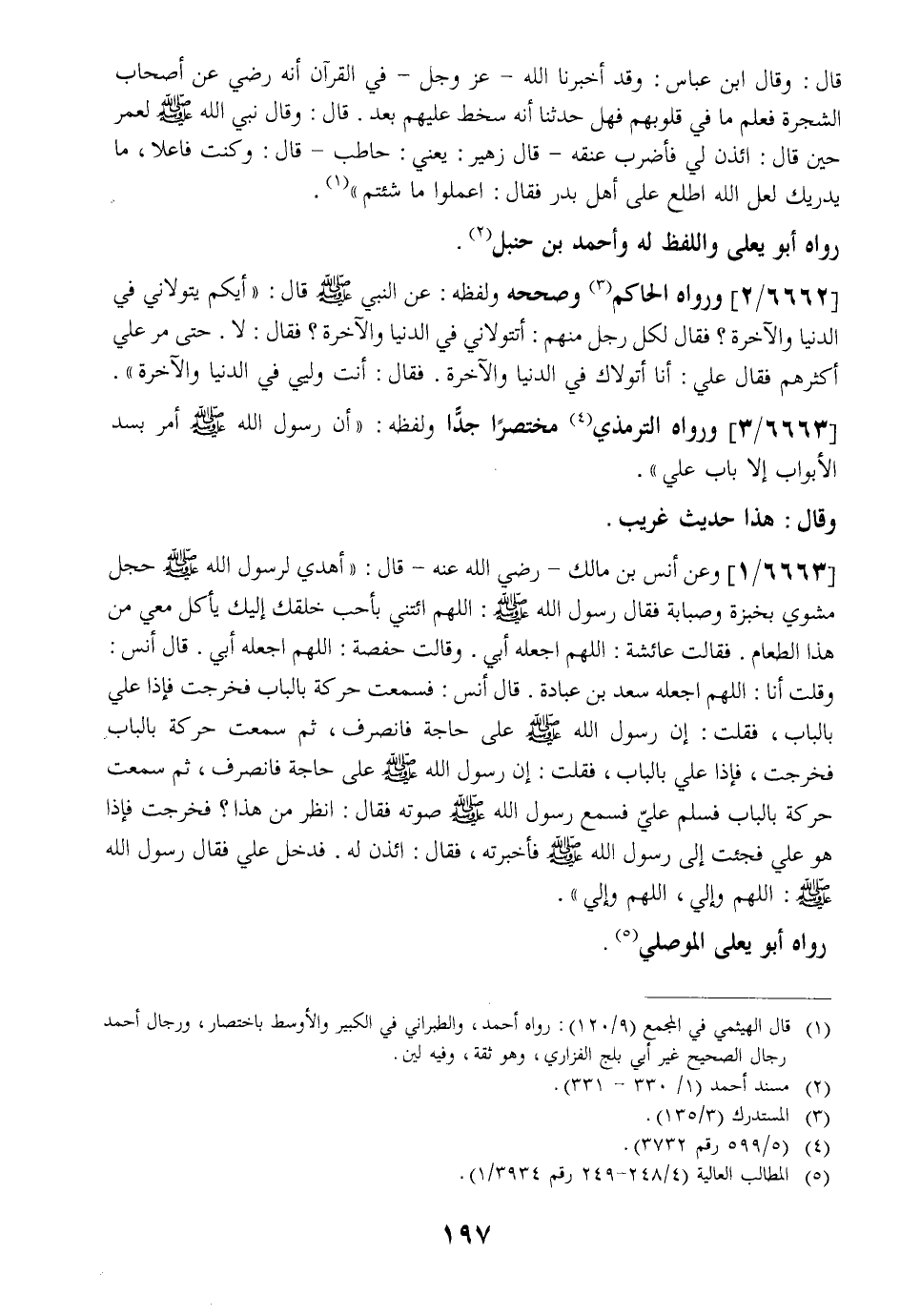 6663 / 1 - وَعَنْ أَنَسِ بْنِ مَالِكٍ- رَضِيَ اللَّهُ عَنْهُ- قَالَ: " أُهْدِيَ لِرَسُولِ اللَّهِ - صَلَّى اللَّهُ عَلَيْهِ وَسَلَّمَ - حَجَلٌ مَشْوِيٌّ بِخُبْزَةٍ وَصُبَابَةٍ فَقَالَ رَسُولُ اللَّهِ - صَلَّى اللَّهُ عَلَيْهِ وَسَلَّمَ -: اللَّهُمَّ ائْتِنِي بِأَحَبِّ خَلْقِكَ إِلَيْكَ يَأْكُلُ مَعِي مِنْ هَذَا الطَّعَامُ. فَقَالَتْ عَائِشَةُ: اللَّهُمَّ اجْعَلْهُ أَبِي. وَقَالَتْ حَفْصَةُ: اللَّهُمَّ اجْعَلْهُ أَبِي. قَالَ أَنَسٌ: وَقُلْتُ أَنَا: اللَّهُمَّ اجْعَلْهُ سَعْدَ بْنَ عُبَادَةَ. قَالَ أَنَسٌ: فَسَمِعْتُ حَرَكَةً بِالْبَابِ فَخَرَجْتُ فَإِذَا عَلِيٌّ بِالْبَابِ فَقُلْتُ: إِنَّ رَسُولَ اللَّهِ - صَلَّى اللَّهُ عَلَيْهِ وَسَلَّمَ - عَلَى حَاجَةٍ فَانْصَرَفَ ثُمَّ سَمِعْتُ حَرَكَةً بِالْبَابِ فَخَرَجْتُ فَإِذَا عَلِيٌّ بِالْبَابِ فَقُلْتُ: إِنَّ رَسُولَ اللَّهِ - صَلَّى اللَّهُ عَلَيْهِ وسلم - على حاجة فانصرف ثم سمعت حركة بالباب فسلم عليّ فَسَمِعَ رَسُولَ اللَّهِ - صَلَّى اللَّهُ عَلَيْهِ وَسَلَّمَ - صوته فقال: انظر من هذا؟ فخرجت فَإِذَا هُوَ عَلِيٌّ فَجِئْتُ إِلَى رَسُولِ اللَّهِ - صَلَّى اللَّهُ عَلَيْهِ وَسَلَّمَ - فَأَخْبَرْتُهُ فَقَالَ ائْذَنْ لَهُ. فَدَخَلَ عَلِيٌّ فَقَالَ رَسُولُ اللَّهِ - صَلَّى اللَّهُ عَلَيْهِ وَسَلَّمَ -: اللهم وَالِي اللَّهُمَّ وَالِي ".
