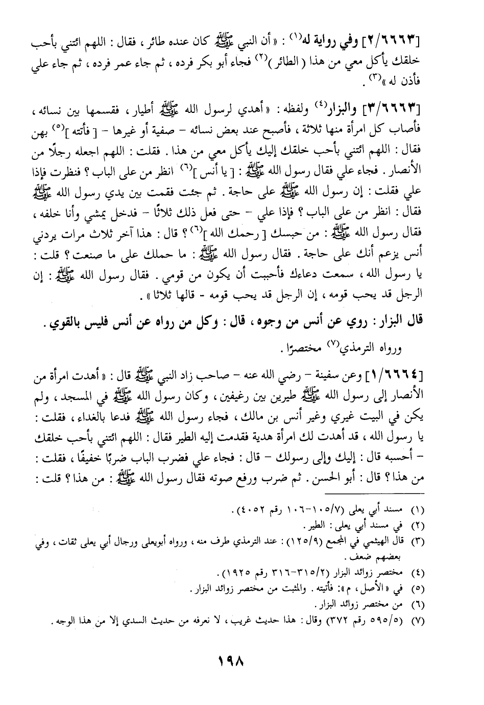 6663 / 3 - وَالْبَزَّارُ وَلَفْظُهُ: " أُهْدِيَ لِرَسُولِ اللَّهِ - صَلَّى اللَّهُ عَلَيْهِ وَسَلَّمَ - أَطْيَارٌ فَقَسَمَهَا بَيْنَ نِسَائِهِ فَأَصَابَ كَلُّ امْرَأَةٍ مِنْهَا ثَلَاثَةً فَأَصْبَحَ عِنْدَ بَعْضِ نِسَائِهِ- صَفِيَّةَ أَوْ غَيْرِهَا- فَأَتَتْهُ بِهِنَّ فَقَالَ: اللَّهُمَّ ائْتِنِي بِأَحَبِّ خَلْقِكَ إِلَيْكَ يَأْكُلُ مَعِي مِنْ هَذَا. فَقُلْتُ: اللَّهُمَّ اجْعَلْهُ رَجُلًا مِنَ الْأَنْصَارِ. فَجَاءَ عَلِيٌّ فَقَالَ رَسُولُ اللَّهِ - صَلَّى اللَّهُ عَلَيْهِ وَسَلَّمَ -: يا أنس انْظُرْ مَنْ عَلَى الْبَابِ؟ فَنَظَرْتُ فَإِذَا عَلِيٌّ فَقُلْتُ: إِنَّ رَسُولَ اللَّهِ - صَلَّى اللَّهُ عَلَيْهِ وَسَلَّمَ - عَلَى حَاجَةٍ. ثُمَّ جِئْتُ فَقُمْتُ بَيْنَ يَدَيْ رَسُولِ اللَّهِ - صَلَّى اللَّهُ عَلَيْهِ وَسَلَّمَ - فَقَالَ: انْظُرْ مَنْ عَلَى الْبَابِ؟ فَإِذَا عَلِيٌّ- حَتَّى فَعَلَ ذَلِكَ ثَلَاثًا- فَدَخَلَ يَمْشِي وَأَنَا خَلْفُهُ فَقَالَ رَسُولُ اللَّهِ - صَلَّى اللَّهُ عَلَيْهِ وَسَلَّمَ -: من حبسك رحمك الله؟ قَالَ: هَذَا آخِرَ ثَلَاثَ مَرَّاتٍ يَرُدُّنِي أَنَسٌ يَزْعُمُ أَنَّكَ عَلَى حَاجَةٍ. فَقَالَ رَسُولُ اللَّهِ - صَلَّى اللَّهُ عَلَيْهِ وَسَلَّمَ - مَا حَمَلَكَ عَلَى مَا صَنَعْتَ؟ قُلْتُ: يَا رَسُولَ اللَّهِ سَمِعْتُ دُعَاءَكَ فَأَحْبَبْتُ أَنْ يَكُونَ مِنْ قَوْمِي. فَقَالَ رَسُولُ اللَّهِ - صَلَّى اللَّهُ عَلَيْهِ وَسَلَّمَ - إن الرَّجُلَ قَدْ يُحِبُّ قَوْمَهُ إِنَّ الرَّجُلَ قَدْ يُحِبُ قَوْمَهُ- قَالَهَا ثَلَاثًا ".