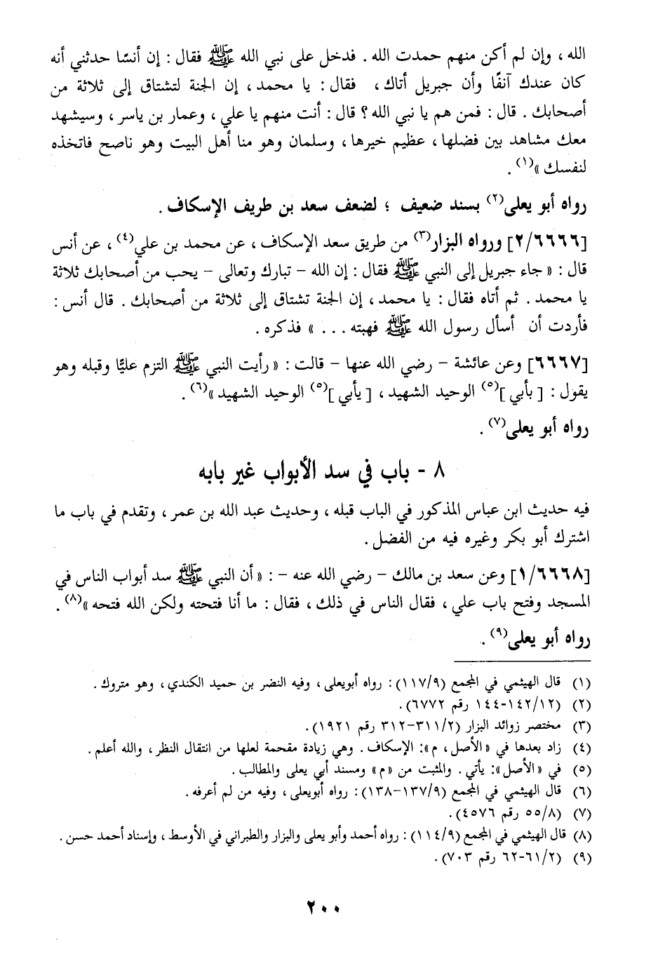 6666 / 2 - وَرَوَاهُ الْبَزَّارُ مِنْ طَرِيقِ سَعْدٍ الإسكاف عن محمد بن علي عَنْ أَنَسٍ قَالَ: " جَاءَ جِبْرِيلُ إِلَى النَّبِيِّ - صَلَّى اللَّهُ عَلَيْهِ وَسَلَّمَ - فَقَالَ: إِنَّ اللَّهَ- تَبَارَكَ وَتَعَالَى- يُحِبُّ مِنْ أَصْحَابِكَ ثَلَاثَةً يَا مُحَمَّدُ. ثُمَّ أَتَاهُ فَقَالَ: يَا مُحَمَّدُ إِنَّ الْجَنَّةَ تَشْتَاقُ إِلَى ثَلَاثَةٍ مِنْ أَصْحَابِكَ. قَالَ أَنَسٌ: فَأَرَدْتُ أَنْ أَسْأَلَ رَسُولَ اللَّهِ - صَلَّى اللَّهُ عَلَيْهِ وَسَلَّمَ - فَهِبْتُهُ ... " فَذَكَرَهُ.