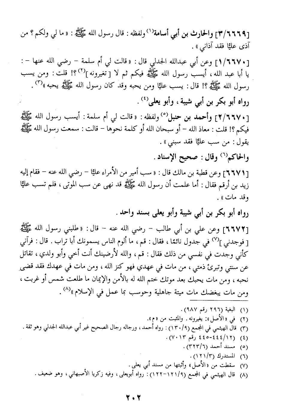 6669 / 3 - وَالْحَارِثُ بْنُ أَبِي أُسَامَةَ وَلَفْظُهُ: قَالَ رَسُولُ اللَّهِ - صَلَّى اللَّهُ عَلَيْهِ وَسَلَّمَ - مَا لِي وَلَكُمْ؟ مَنْ آذَى عَلِيًّا فَقَدْ آذَانِي ".