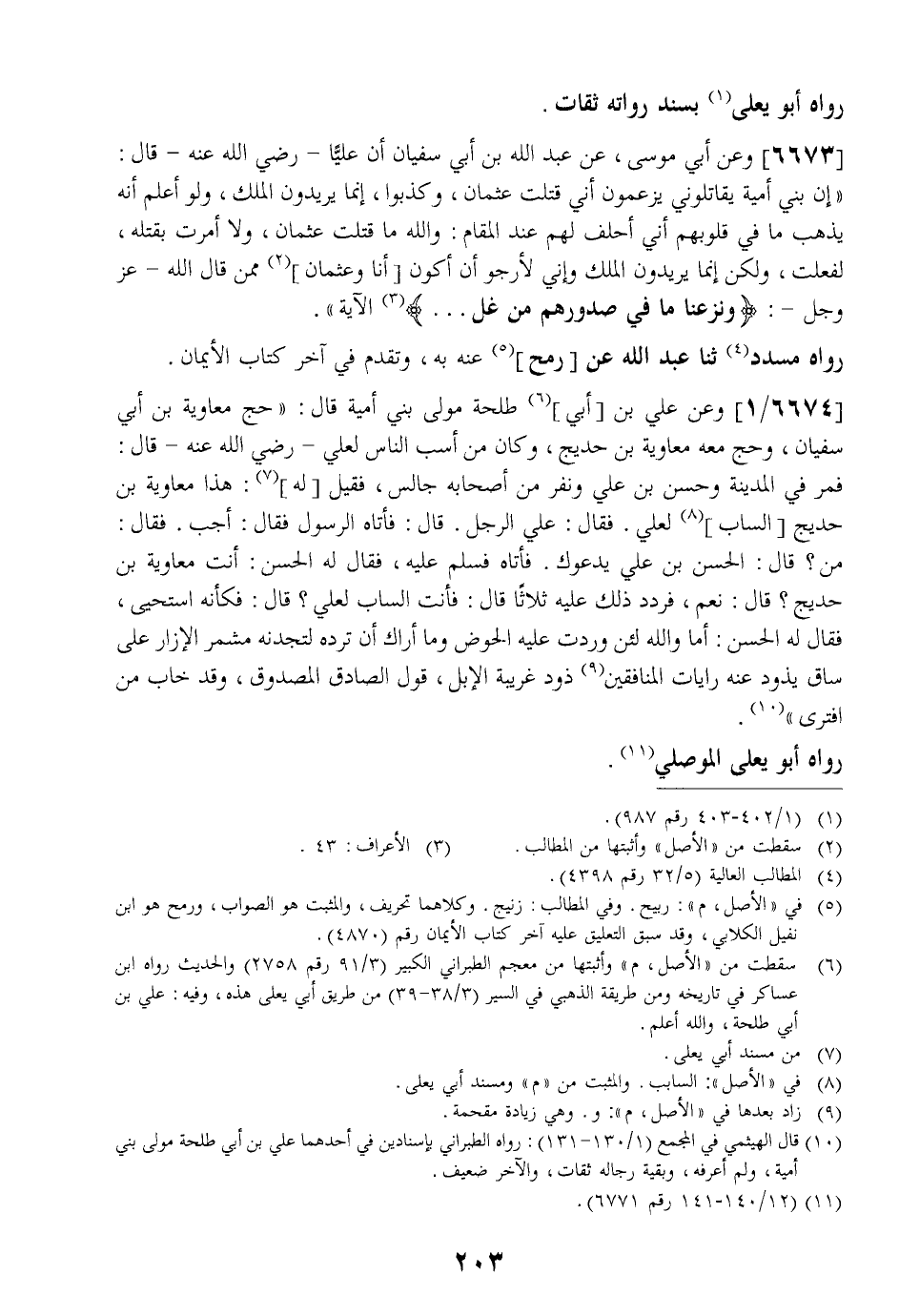 6674 / 1 - وعن علي بن أبي طَلْحَةَ مَوْلَى بَنِي أُمَيَّةَ قَالَ: "حَجَّ مِعَاوِيَةُ بْنُ أَبِي سُفْيَانَ وَحَجَّ مَعَهُ مُعَاوِيَةُ بْنُ حديج وَكَانَ مِنْ أَسَبِّ النَّاسِ لِعَلِيٍّ- رَضِيَ اللَّهُ عَنْهُ- قَالَ: فَمَرَّ فِي الْمَدِينَةِ وَحَسَنُ بْنُ علي ونفر من أصحابه جالس فقيل له: هذا معاوية بن حديج الساب لعلي. فقال: علي الرجل. قَالَ: فَأَتَاهُ الرَّسُولُ فَقَالَ: أَجِبْ. فَقَالَ: مَنْ؟ قَالَ: الْحَسَنُ بْنُ عَلِيٍّ يَدْعُوكَ. فَأَتَاهُ فَسَلَّمَ عَلَيْهِ فَقَالَ لَهُ الْحَسَنُ: أَنْتَ مُعَاوِيَةُ بْنُ حديج؟ قَالَ: نَعَمْ فَرَدَّدَ ذَلِكَ عَلَيْهِ ثَلَاثًا قَالَ: فأنت الساب لعلي؟ قال: فكأنه استحيى فقال له الْحَسَنُ: أَمَا وَاللَّهِ لَئِنْ وَرَدْتَ عَلَيْهِ - الْحَوْضَ وَمَا أَرَاكَ أَنْ تَرِدَهُ لَتَجِدَنَّهُ مُشَمِّرَ الْإِزَارِ على ساق يذود عنه رايات المنافقين ذود غَرِيبَةِ الْإِبِلِ قَوْلُ الصَّادِقِ الْمَصْدُوقِ وَقَدْ خَابَ من افترى ".