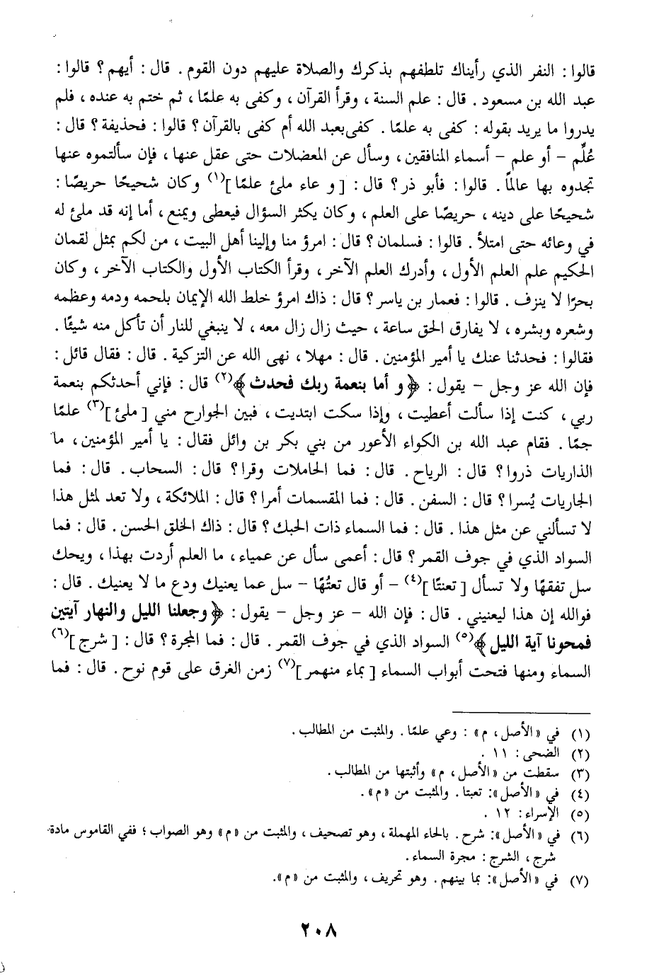 قَالُوا: النَّفَرَ الَّذِي رَأَيْنَاكَ تُلْطِفُهُمْ بِذِكْرِكَ وَالصَّلَاةِ عَلَيْهِمْ دُوْنَ الْقَوْمِ. قَالَ: أَيُّهُمْ؟ قَالُوا: عَبْدُ اللَّهِ بْنُ مَسْعُودٍ. قَالَ: عَلِمَ السُّنَّةَ وَقَرَأَ القرآن وكفى به علمًا ثم ختم به عنده فلم يدروا ما يريد بقوله: كفى به علمًا. كفى بعبد الله أم كفى بالقرآن؟ قال: فَحُذَيْفَةُ؟ قَالَ: عُلِّم- أَوْ عُلِّمَ- أَسْمَاءَ الْمُنَافِقِينَ وَسَأَلَ عَنِ الْمُعْضِلَاتِ حَتَّى عَقَلَ عَنْهَا فَإِنْ سَأَلْتُمُوهُ عَنْهَا تَجِدُوهُ بِهَا عَالِمًا. قَالُوا: فَأَبُو ذر؟ قال: وعاء ملئ علمًا وَكَانَ شَحِيحًا حَرِيصًا: شَحِيحًا عَلَى دِينِهِ حَرِيصًا عَلَى الْعِلْمِ وَكَانَ يُكْثِرُ السُّؤَالَ فَيُعْطَى وَيُمْنَعُ أَمَّا إِنَّهُ قَد مُلِئَ لَهُ فِي وِعَائِهِ حَتَّى امْتَلَأَ. قَالُوا: فَسَلْمَانُ؟ قَالَ: امْرِؤٌ مِنَّا وَإِلَيْنَا أَهْلَ الْبَيْتِ مَنْ لَكُمُ بِمِثْلِ لُقْمَانَ الْحَكِيمِ عَلِمَ الْعِلْمَ الْأَوَّلَ وَأَدْرَكَ الْعِلْمَ الْآخَرَ وَقَرَأَ الْكِتَابَ الْأَوَّلَ وَالْكِتَابَ الْآخِرَ وَكَانَ بَحْرًا لَا يُنْزَفُ. قَالُوا: فَعَمَّارُ بْنُ يَاسِرٍ؟ قَالَ: ذَاكَ امْرِؤٌ خَلَطَ اللَّهُ الْإِيمَانَ بِلَحْمِهِ وَدَمِهِ وَعَظْمِهِ وَشَعْرِهِ وَبَشْرِهِ لَا يُفَارِقُ الْحَقَّ ساعة حيث زال زَالَ مَعَهُ لَا يَنْبَغِي لِلنَّارِ أَنْ تَأْكُلَ منه شيئًا. فقالوا: فحدثنا عنك يأمير الْمُؤْمِنِينَ. قَالَ: مَهْلًا نَهَى اللَّهُ عَنِ التَّزْكِيَةِ. قال: فَقَالَ قَائِلٌ: فَإِنَّ اللَّهَ عَزَّ وَجَلَّ- يقول: {وأما بنعمة ربك فحدث} قَالَ: فَإِنِّي أُحَدِّثُكُمْ بِنِعْمَةِ رَبِّي كُنْتُ إِذَا سَأَلْتُ أُعْطِيتُ وَإِذَا سَكَتُّ ابْتُدِيتُ فَبَيْنَ الْجَوَارِحِ مني ملئ عِلْمًا جَمًّا. فَقَامَ عَبْدُ اللَّهِ بْنُ الْكَوَّاءِ الْأَعْوَرُ مِنْ بَنِي بَكْرِ بْنِ وَائِلٍ فَقَالَ: يأمير المؤمنين ما الذاريات ذروا؟ قَالَ: الرِّيَاحُ. قَالَ: فَمَا الْحَامِلَاتِ وِقْرًا؟ قَالَ: السَّحَابُ. قَالَ: فَمَا الْجَارِيَاتُ يُسرا؟ قَالَ: السُّفُنُ. قَالَ: فَمَا الْمُقَسِّمَاتِ أَمْرًا؟ قَالَ: الْمَلَائِكَةُ وَلَا تَعُدْ لِمِثْلِ هَذَا لَا تَسْأَلْنِي عَنْ مِثْلِ هَذَا. قَالَ: فما السماء ذات الحبك؟ قَالَ: ذَاكَ الْخُلُقُ الْحَسَنُ. قَالَ: فَمَا السَّوَادُ الَّذِي فِي جَوْفِ الْقَمَرِ؟ قَالَ: أَعْمَى سَأَلَ عن عمياء ما العلم أردت بهذا ويحك سل تفقهًا ولا تسأل تعنتًا - أَوْ قَالَ تعتُهًا- سَلْ عَمَّا يَعْنِيكَ وَدَعْ مَا لَا يَعْنِيكَ. قَالَ: فَوَاللَّهِ إِنْ هَذَا لَيَعْنِينِي. قَالَ: فَإِنَّ اللَّهَ- عَزَّ وَجَلَّ- يَقُولُ: {وَجَعَلْنَا اللَّيْلَ وَالنَّهَارَ آيَتَيْنِ فَمَحَوْنَا آيَةَ اللَّيْلِ} السواد الَّذِي فِي جَوْفِ الْقَمَرِ. قَالَ: فَمَا الْمَجَرَّةُ؟ قال: شرج السَّمَاءِ وَمِنْهَا فُتِحَتْ أَبْوَابُ السَّمَاءِ بَمَاءٍ مُنْهَمِرٍ زَمَنَ الْغَرَقِ عَلَى قَوْمِ نُوحٍ. قَالَ: فَمَا