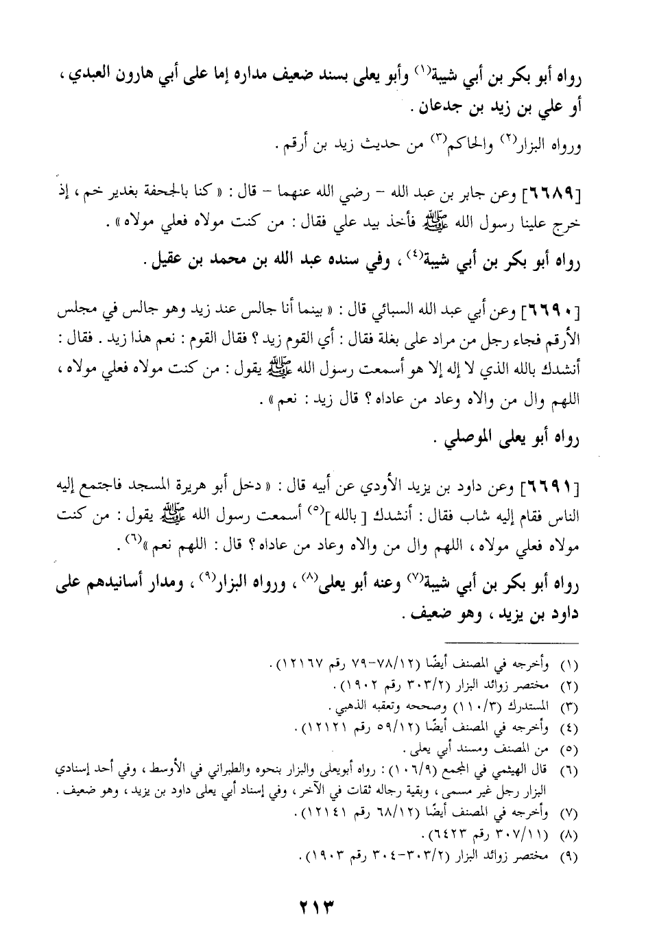 6690 - وعن أبي عبد الله السبائي قال: " بينمأنا جَالِسٌ عِنْدَ زَيْدٍ وَهُو جَالِسٌ فِي مَجْلِسِ الْأَرْقَمِ فَجَاءَ رَجُلٌ مِنْ مُرَادٍ عَلَى بَغْلَةٍ فَقَالَ: أَيُّ الْقَوْمِ زَيْدٌ؟ فَقَالَ الْقَوْمُ: نَعَمْ هَذَا زَيْدٌ. فَقَالَ: أَنْشُدُكَ بِاللَّهِ الَّذِي لَا إِلَهَ إِلَّا هُوَ أَسَمِعْتَ رَسُولَ اللَّهِ - صَلَّى اللَّهُ عَلَيْهِ وَسَّلَمَ - يَقُولُ: مَنْ كُنْتُ مَوْلَاهُ فَعَلِيُّ مَوْلَاهُ اللَّهُمَّ وَالِ من والاه وعاد مَنْ عَادَاهُ؟ قَالَ زَيْدٌ: نَعَمْ.