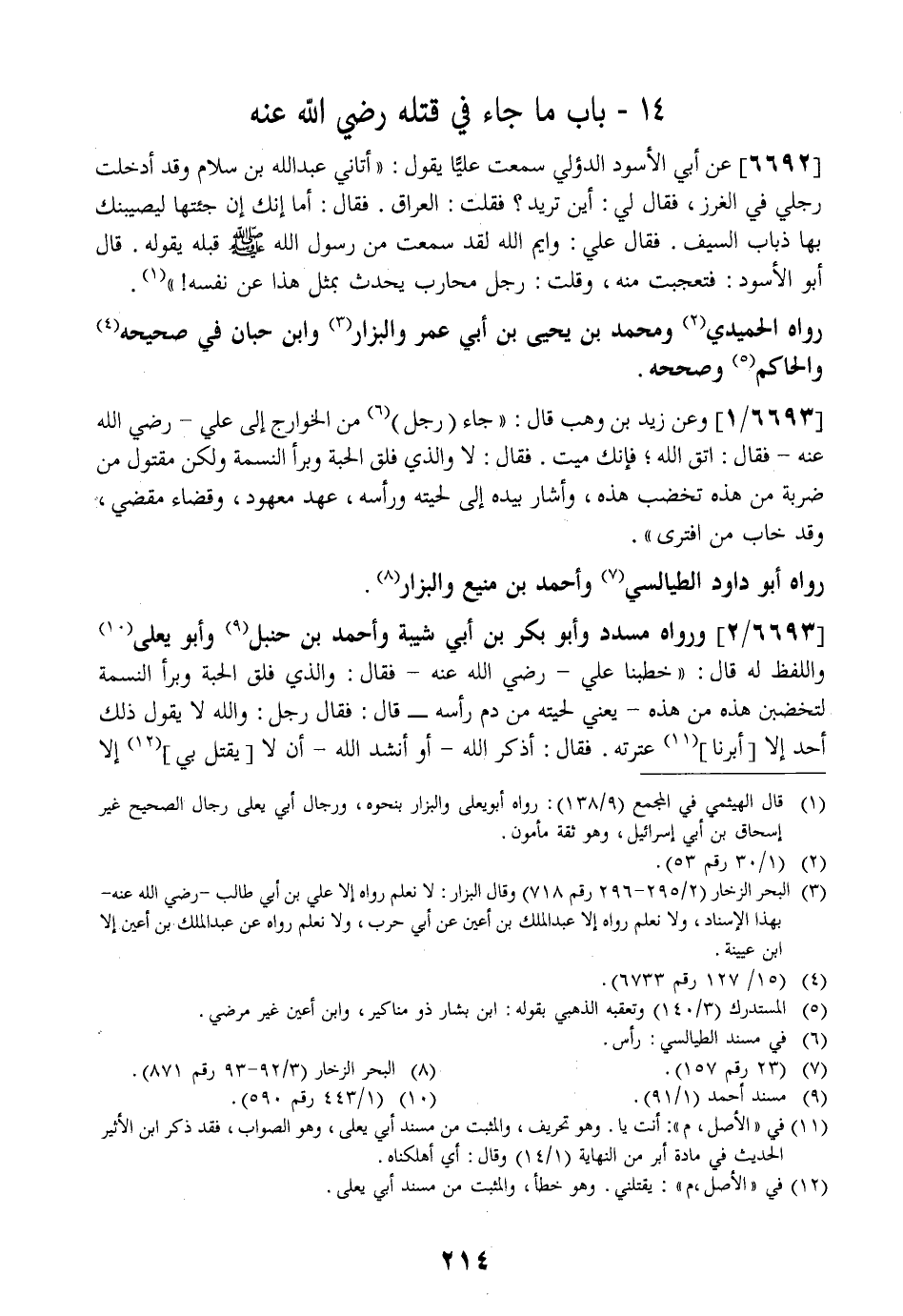 6693 / 2 - وَرَوَاهُ مُسَدَّدٌ وَأَبُو بَكْرِ بْنُ أَبِي شَيْبَةَ وَأَحْمَدُ بْنُ حَنْبَلٍ وَأَبُو يَعْلَى وَاللَّفْظُ لَهُ قَالَ: " خَطَبَنَا عَلِيٌّ- رضي الله عنه- فقال: وَالَّذِي فَلَقَ الْحَبَّةَ وَبَرَأَ النَّسْمَةَ لَتُخَضَّبَنَّ هَذِهِ من هَذِهِ- يَعْنِي لِحْيَتَهُ مِنْ دَمِ رَأْسِهِ- قَالَ: فَقَالَ رَجُلٌ: وَاللَّهِ لَا يَقُولُ ذَلِكَ أَحَدٌ إلا أبرنا عِتْرَتَهُ. فَقَالَ: أَذْكُرُ اللَّهَ- أَوْ أَنْشُدُ اللَّهَ- أَنْ لَا يُقْتَلَ بِي إِلَّا