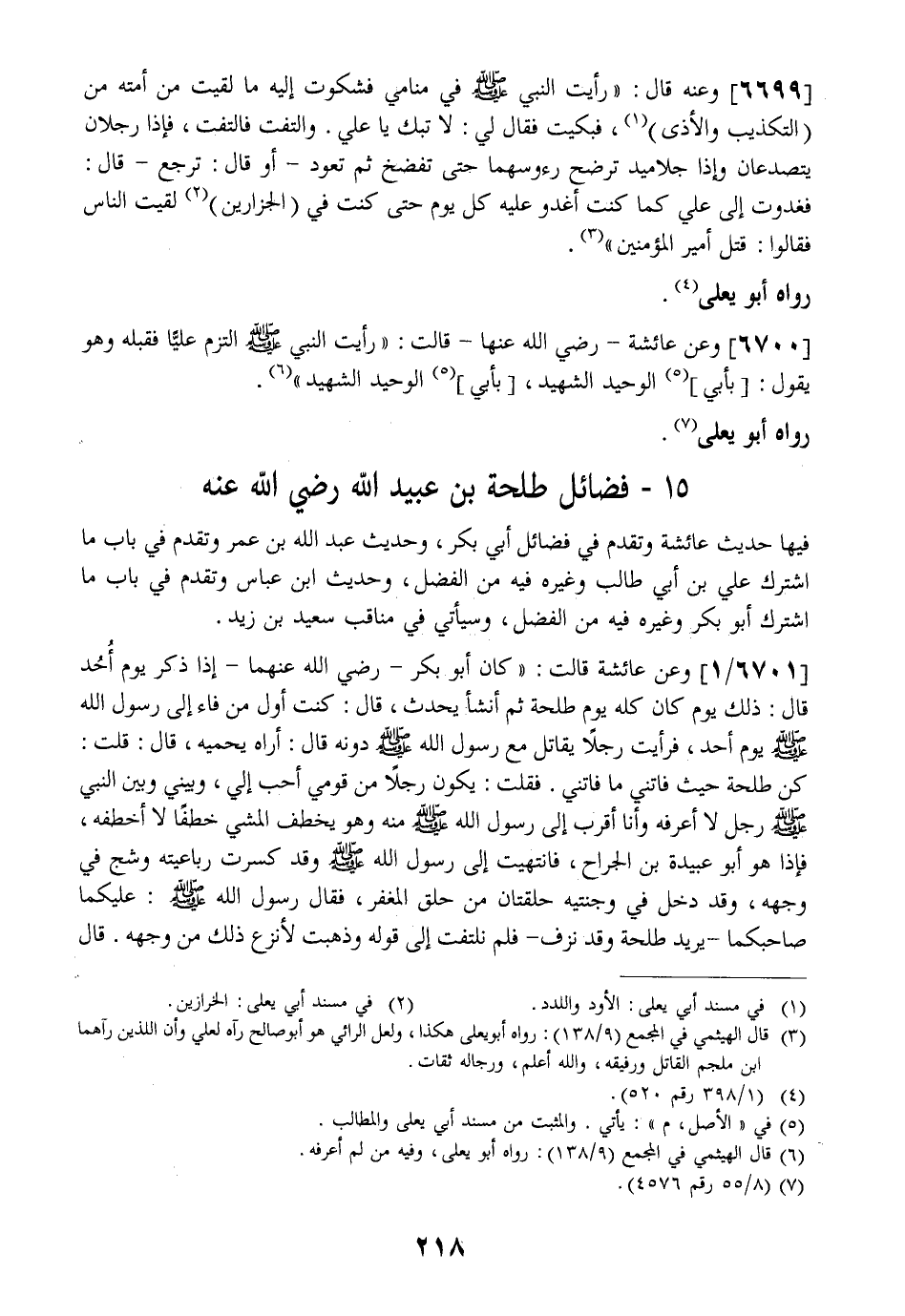 6701 / 1 - وَعَنْ عَائِشَةَ قَالَتْ: كَانَ أَبُو بَكْرٍ- رَضِيَ اللَّهُ عَنْهُمَا- إِذَا ذُكِرَ يَوْمُ أُحُد قَالَ: ذَلِكَ يَوْمٌ كَانَ كُلَّهُ يوم طَلْحَةُ ثُمَّ أَنْشَأَ يُحَدِّثُ قَالَ: كُنْتُ أَوَّلَ مَنْ فَاءَ إِلَى رَسُولِ اللَّهِ - صَلَّى اللَّهُ عَلَيْهِ وَسَلَّمَ - يَوْمَ أُحُدٍ فَرَأَيْتُ رَجُلًا يُقَاتِلُ مَعَ رَسُولِ اللَّهِ - صَلَّى اللَّهُ عَلَيْهِ وَسَلَّمَ - دُوْنَهُ قَالَ: أَرَاهُ يَحْمِيهِ قَالَ: قُلْتُ: كن طلحة حيث فاتني ما فَاتَنِي. فَقُلْتُ: يَكُونُ رَجُلًا مِنْ قَوْمِي أَحَبَّ إِلَيَّ وَبَيْنِي وَبَيْنَ النَّبِيِّ - صَلَّى اللَّهُ عَلَيْهِ وسلم - رجل لَا أَعْرِفُهُ وَأَنَا أَقْرَبُ إِلَى رَسُولِ اللَّهِ - صَلَّى اللَّهُ عَلَيْهِ وَسَلَّمَ - مِنْهُ وَهُوَ يَخْطِفُ الْمَشْيَ خَطْفًا لَا أَخْطِفْهُ فَإِذَا هُوَ أَبُو عُبَيْدَةُ بْنُ الْجَرَّاحِ فَانْتَهَيْتُ إِلَى رَسُولِ اللَّهِ - صَلَّى اللَّهُ عَلَيْهِ وَسَلَّمَ - وَقَدْ كُسِرَتْ رُبَاعِيَّتُهُ وَشُجَّ فِي وَجْهِهِ وَقَدْ دَخَلَ فِي وَجْنَتَيْهِ حلقتان من حلق المغفر فَقَالَ رَسُولُ اللَّهِ - صَلَّى اللَّهُ عَلَيْهِ وَسَلَّمَ - عليكما صَاحِبُكُمَا- يُرِيدُ طَلْحَةَ وَقَدْ نَزَفَ- فَلَمْ نَلْتَفِتْ إِلَى قَوْلِهِ وَذَهَبْتُ لِأَنْزِعَ ذَلِكَ مِنْ وَجْهِهِ. قال