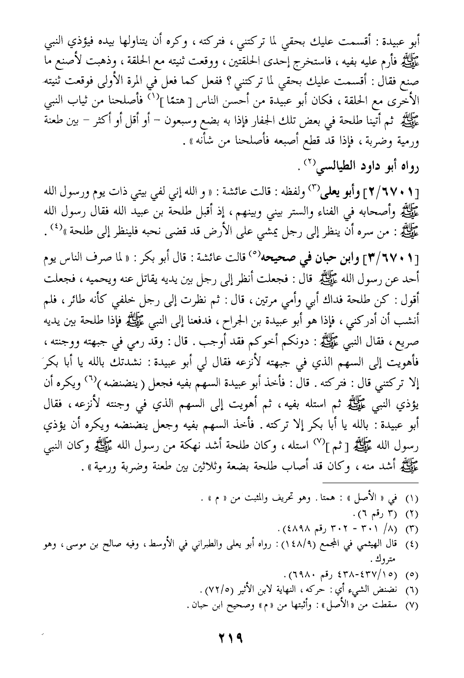6701 / 3 - وَابْنُ حِبَّانَ فِي صَحِيحِهِ قَالَتْ عَائِشَةُ: قَالَ أَبُو بَكْرٍ: لَمَّا صُرِفَ النَّاسُ يَوْمَ أُحُدٍ عَنْ رَسُولِ اللَّهِ - صَلَّى اللَّهُ عَلَيْهِ وَسَلَّمَ - قال: فَجَعَلْتُ أَنْظُرُ إِلَى رَجُلٍ بَيْنَ يَدَيْهِ يُقَاتِلُ عَنْهُ وَيَحْمِيهِ فَجَعَلْتُ أَقُولُ: كُنْ طَلْحَةَ فِدَاكَ أَبِي وَأُمِّي مَرَّتَيْنِ قَالَ: ثُمَّ نَظَرْتُ إِلَى رَجُلٍ خَلْفِي كَأَنَّهُ طَائِرٌ فَلَمْ أَنْشَبْ أَنْ أَدْرَكَنِي فَإِذَا هُوَ أَبُو عُبَيْدَةَ بْنُ الْجَرَّاحِ فَدَفَعَنَا إِلَى النَّبِيِّ - صَلَّى اللَّهُ عَلَيْهِ وَسَلَّمَ - فإذا طلحة بين يديه صريع فَقَالَ النَّبِيُّ - صَلَّى اللَّهُ عَلَيْهِ وَسَلَّمَ - دُوْنَكُمْ أخوكم فقد أوجبا. قال: وقد رمي في جبهته ووجنته فأهويت إلى السهم الذي في جبهته لأنزعه فقال لي أَبُو عُبَيْدَةَ: نَشَدْتُكَ بِاللَّهِ يَا أَبَا بَكْرٍ إلا تركته قَالَ: فَأَخَذَ أَبُو عُبَيْدَةَ السَّهْمَ بِفِيهِ فَجَعَلَ (ينضنضه) وَيَكْرَهُ أَنْ يُؤْذِيَ النَّبِيَّ - صَلَّى اللَّهُ عَلَيْهِ وَسَلَّمَ - ثُمَّ اسْتَلَّهُ بِفِيهِ ثُمَّ أَهْوَيْتُ إِلَى السَّهْمِ الَّذِي فِي وَجْنَتِهِ لِأَنْزِعَهُ فَقَالَ أَبُو عُبَيْدَةَ: بِاللَّهِ يَا أَبَا بَكْرٍ إِلَّا تَرَكْتَهُ. فأخذ السهم بفيه وجعل ينضنضه وَيَكْرَهَ أَنْ يُؤْذِيَ رَسُولُ اللَّهِ - صَلَّى اللَّهُ عَلَيْهِ وَسَلَّمَ - (ثُمَّ استله وَكَانَ طَلْحَةُ أَشَدَّ نَهْكَةً مِنْ رَسُولِ اللَّهِ - صَلَّى اللَّهُ عَلَيْهِ وَسَلَّمَ - وَكَانَ النَّبِيُّ - صَلَّى الله عليه وسلم - أشد منه وكان قد أَصَابُ طَلْحَةَ بِضْعَةً وَثَلَاثِينَ بَيْنَ طَعْنَةٍ وَضَرْبَةٍ ورمية ".