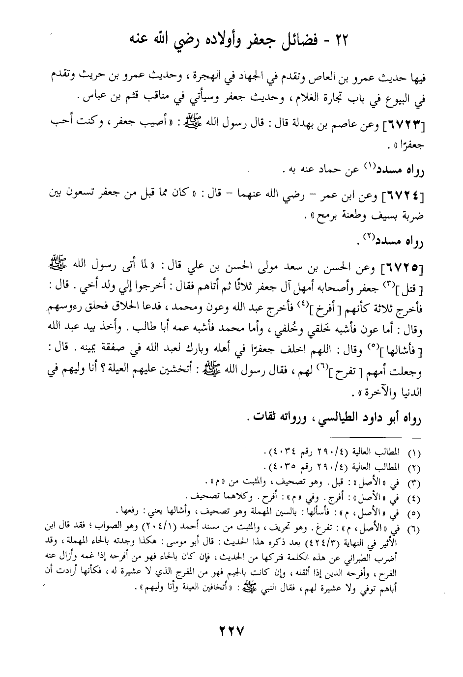 6725 - وَعَنِ الْحَسَنِ بْنِ سَعْدٍ مَوْلَى الْحَسَنِ بْنِ عَلِيٍّ قَالَ: "لَمَّا أَتَى رَسُولَ اللَّهِ - صَلَّى اللَّهُ عَلَيْهِ وَسَلَّمَ - قَتْلَ جَعْفَرٍ وَأَصْحَابِهُ أَمْهَلَ آلَ جَعْفَرٍ ثَلَاثًا ثم أَتَاهُمْ فَقَالَ: أَخْرِجُوا إِلَيَّ وَلَدَ أَخِي. قَالَ: فأخرج ثلاثة كأنهم أفرخ فأخرج عبد الله وعون ومُحَمَّدٌ فَدَعَا الْحَلَّاقَ فَحَلَقَ رُءُوسَهُمْ وَقَالَ: أَمَّا عون فأشبه خَلقي وخُلفي وَأَمَّا مُحَمَّدٌ فَأَشْبَهَ عَمَّهُ أَبَا طَالِبٍ. وَأَخَذَ بِيَدِ عَبْدِ اللَّهِ فَأَشَالَهَا وَقَالَ: اللَّهُمَّ اخْلِفْ جَعْفَرًا فِي أَهْلِهِ وَبَارِكْ لِعَبْدِ اللَّهِ فِي صفقة يمينه. قال: وجعلت أمهم تفرح لَهُمْ فَقَالَ رَسُولُ اللَّهِ - صَلَّى اللَّهُ عَلَيْهِ وَسَلَّمَ -: أَتَخْشَيْنَ عَلَيْهِمُ الْعَيَلَةَ؟ أَنَا وَلِيُّهُمْ فِي الدُّنْيَا وَالْآخِرَةِ ".