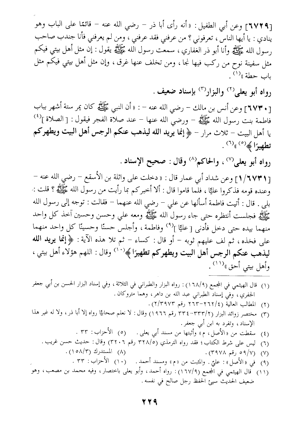 6731 / 1 - وعن شداد أبي عمار قال: " دخلت على وَاثِلَةَ بْنِ الْأَسْقَعِ- رَضِيَ اللَّهُ عَنْهُ- وَعِنْدَهُ قومه فذكروا عليًّا فلما قاموا قَالَ أَلَا أُخْبِرُكُمْ بِمَا رَأَيْتِ مِنْ رَسُولِ اللَّهِ - صَلَّى اللَّهُ عَلَيْهِ وَسَلَّمَ - قُلْتُ: بَلَى. قَالَ: أَتَيْتُ فَاطِمَةَ أَسْأَلُهَا عَنْ عَلِيٍّ- رَضِيَ اللَّهُ عَنْهُمَا- فَقَالَتْ: تَوَجَّهَ إِلَى رَسُولِ اللَّهِ - صَلَّى اللَّهُ عَلَيْهِ وَسَلَّمَ - فَجَلَسْتُ أَنْتَظِرُهُ حَتَّى جَاءَ رَسُولُ اللَّهِ - صَلَّى اللَّهُ عَلَيْهِ وَسَلَّمَ - وَمَعَهُ عَلِيٌّ وَحَسَنٌ وَحُسَيْنٌ آخِذٌ كُلُّ وَاحِدٍ مِنْهُمَا بَيَدِهِ حَتَّى دَخَلَ فَأَدْنَى عَلِيًّا وَفَاطِمَةَ وَأَجْلَسَ حَسَنًا وَحُسَيْنًا كُلَّ وَاحِدٍ مِنْهُمَا عَلَى فخذه ثم دف عليهم ثوبه- أَوْ قَالَ: كِسَاءً- ثُمَّ تَلَا هَذِهِ الْآيَةَ: {إِنَّمَا يُرِيدُ اللَّهُ لِيُذْهِبَ عَنْكُمُ الرِّجْسَ أَهْلَ البيت ويطهركم تطهيرًا} وقال: اللهم هؤلاء أهل بيتي بيتي واهل أحق ".