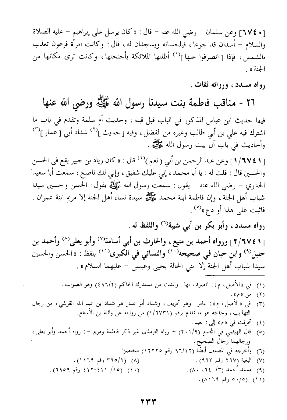 6741 / 2 - 2وَرَوَاهُ أَحْمَدُ بْنُ مَنِيعٍ وَالْحَارِثُ بْنُ أَبِي أُسَامَةَ وَأَبُو يَعْلَى وَأَحْمَدُ بْنُ حَنْبَلٍ وَابْنُ حِبَّانَ فِي صَحِيحِهِ وَالنَّسَائِيُّ فِي الْكُبْرَى بِلَفْظِ: " الْحَسَنُ وَالْحُسَيْنُ سَيِّدَا شَبَابِ أَهْلِ الْجَنَّةِ إِلَّا ابْنَيِ الْخَالَةِ يَحْيَى وَعِيسَى- عَلَيْهِمَا السلام ".