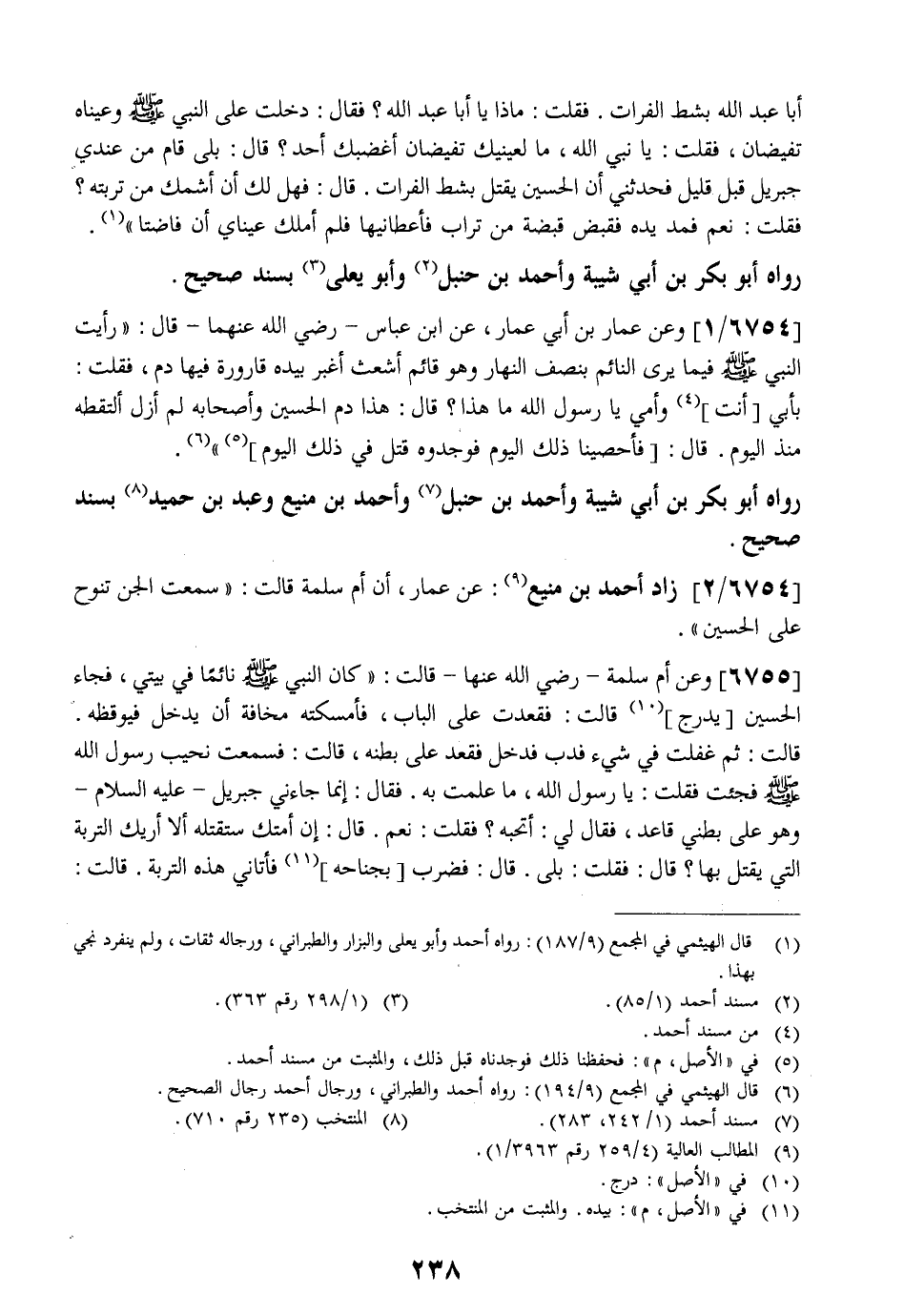 أَبَا عَبْدِ اللَّهِ بِشَطِّ الْفُرَاتِ. فَقُلْتُ: مَاذَا يَا أَبَا عَبْدِ اللَّهِ؟ فَقَالَ: دَخَلْتُ عَلَى النَّبِيِّ - صَلَّى اللَّهُ عَلَيْهِ وَسَلَّمَ - وَعَيْنَاهُ تَفِيضَانِ فقلت: يا نبي الله ما لعينيك تفيضان أغضبك أَحَدٌ؟ قَالَ: بَلَى قَامَ مَنْ عِنْدِي جِبْرِيلُ قَبْلَ قَلِيلٍ فَحَدَّثَنِي أَنَّ الْحُسَيْنَ يُقْتَلُ بِشَطِّ الْفُرَاتِ. قَالَ: فَهَلَ لَكَ أَنْ أُشِمَّكَ مِنْ تُرْبَتِهِ؟ فَقُلْتُ: نَعَمْ فَمَدَّ يَدَهُ فَقَبَضَ قَبْضَةً مِنْ تُرَابٍ فَأَعْطَانِيهَا فَلَمْ أَمْلُكَ عَيْنَايَ أَنْ فَاضَتَا ". رَوَاهُ أَبُو بَكْرِ بْنُ أَبِي شَيْبَةَ وَأَحْمَدُ بْنُ حَنْبَلٍ وَأَبُو يَعْلَى بِسَنَدٍ صَحِيحٍ.