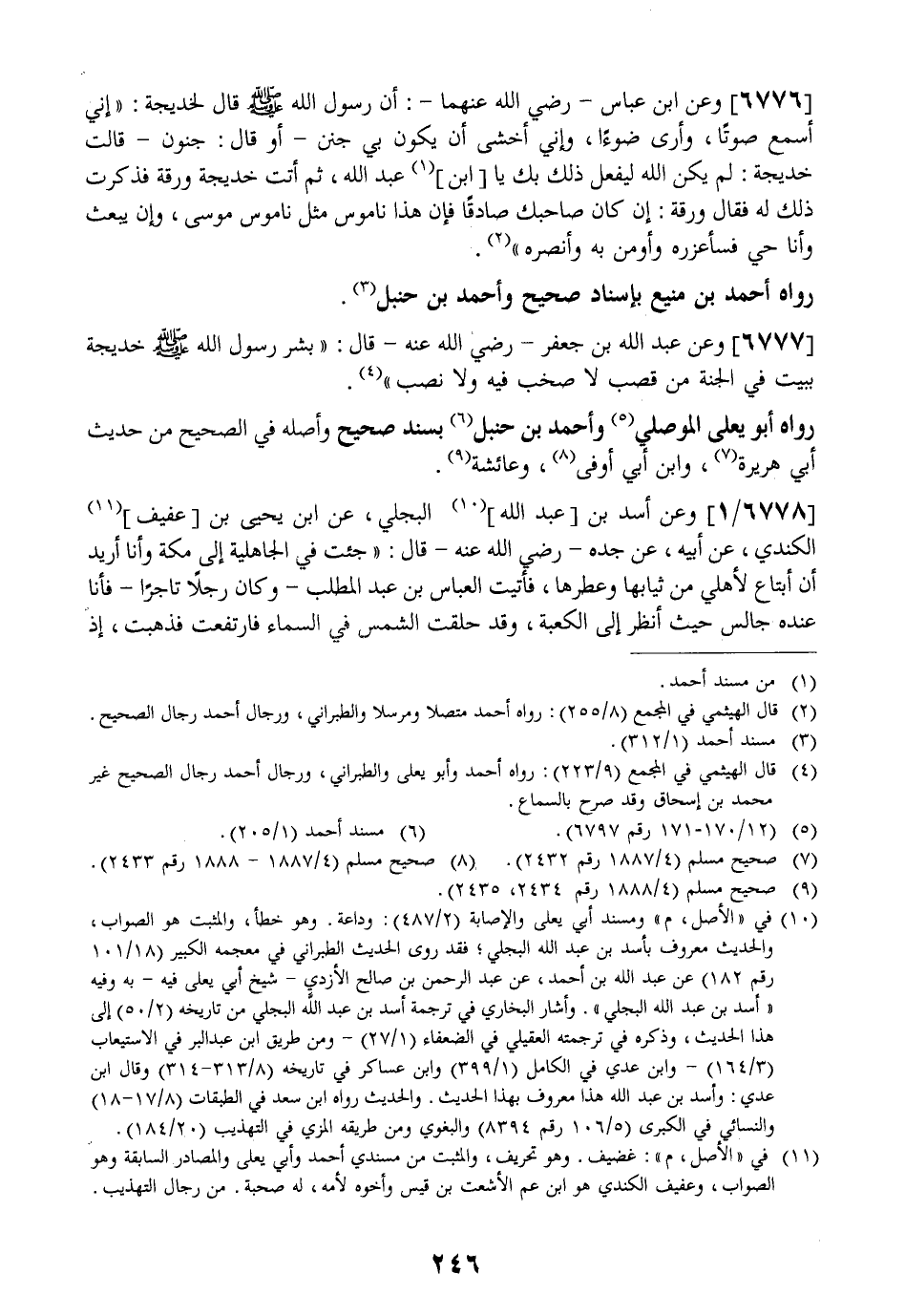 6776 - وَعَنِ ابْنُ عَبَّاسٍ- رَضِيَ اللَّهُ عَنْهُمَا-: أَنّ رَسُولَ اللَّهِ - صَلَّى الله عليه وسلم - قال لِخَدِيجَةَ: " إِنِّي أَسْمَعُ صَوْتًا وَأَرَى ضَوْءًا وَإِنِّي أَخْشَى أَنْ يَكُوْنَ بِي جَنَنٌ- أَوْ قَالَ: جُنُونٌ- قَالَتْ خَدِيجَةُ: لَمْ يَكُنِ اللَّهُ لِيَفْعَلَ ذلك بك يا ابن عَبْدَ اللَّهِ ثُمَّ أَتَتَ خَدِيجَةُ وَرَقَةَ فَذَكَرَتَ ذَلِكَ لَهُ فَقَالَ وَرَقَةُ: إِنْ كَانَ صَاحِبُكِ صادقًا فإن هذا ناموس مثل ناموس موسى وإن يبعث وأنا حي فسأعزره وَأُومِنُ بِهِ وَأَنْصُرُهُ ".