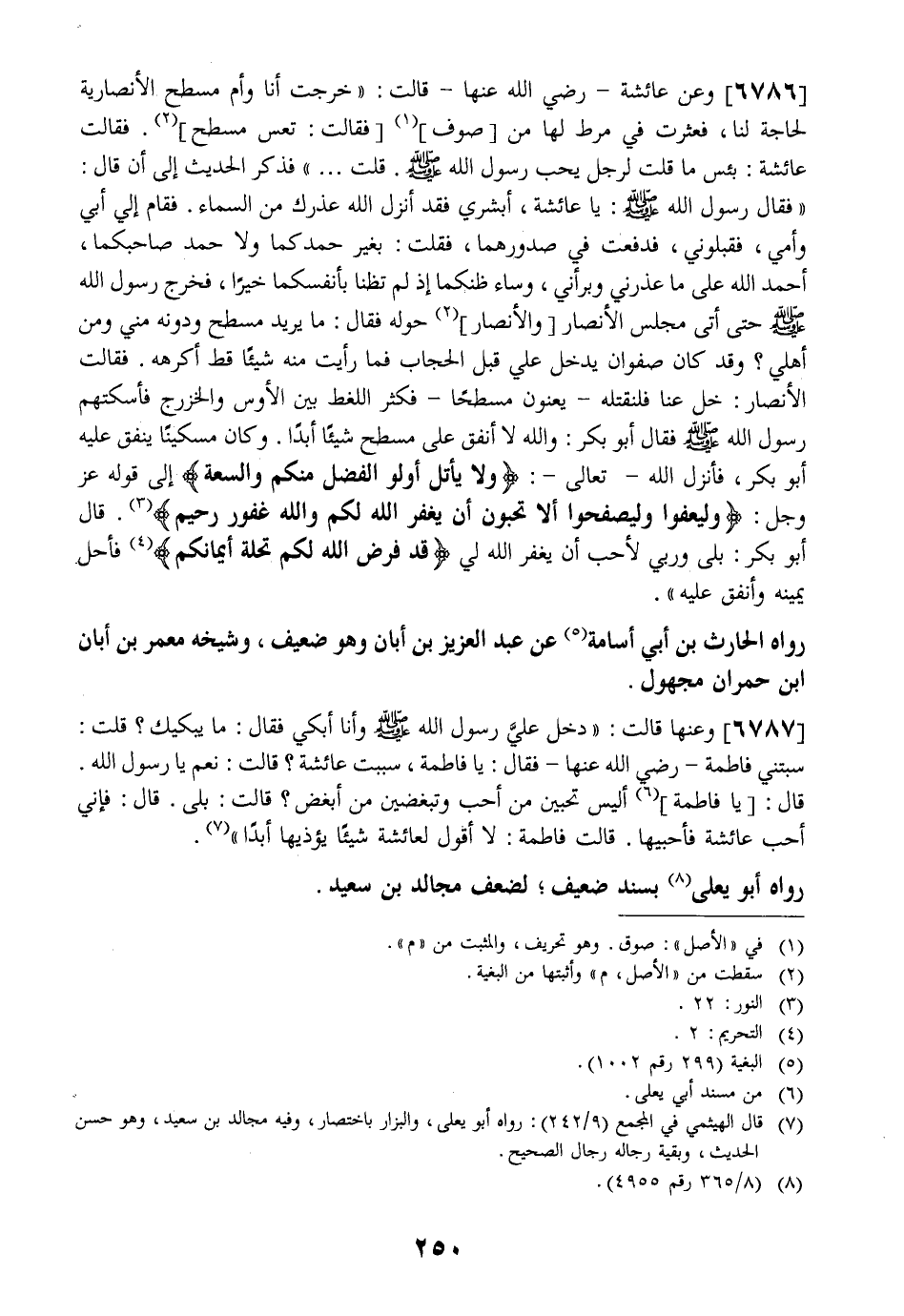 6786 - وَعَنْ عَائِشَةَ- رَضِيَ اللَّهُ عَنْهَا- قَالَتْ: " خَرَجْتُ أَنَا وَأُمُّ مِسْطَحٍ الْأَنْصَارِيَّةُ لِحَاجَةٍ لَنَا فَعَثَرْتُ فِي مُرُطٍ لَهَا مِنْ صُوْفٍ فَقَالَتْ: تعس مسطح. فَقَالَتْ عَائِشَةُ: بِئْسَ مَا قُلْتَ لِرَجُلٍ يُحِبُّ رَسُولُ اللَّهِ - صَلَّى اللَّهُ عَلَيْهِ وَسَلَّمَ - قُلْتُ ... " فَذَكَرَ الْحَدِيثَ إِلَى أَنْ قَالَ: " فَقَالَ رَسُولُ اللَّهِ - صَلَّى اللَّهُ عَلَيْهِ وَسَلَّمَ -: يَا عَائِشَةُ أَبْشِرِي فَقَدْ أَنْزَلَ اللَّهُ عُذْرَكِ مِنَ السَّمَاءِ. فَقَامَ إِلَيَّ أَبِي وَأُمِّي فَقَبَّلُونِي فَدَفَعْتُ فِي صُدُورِهِمَا فَقُلْتُ: بِغَيْرِ حَمْدِكُمَا وَلَا حَمْدِ صَاحِبِكُمَا أَحْمَدُ اللَّهُ عَلَى مَا عَذَرَنِي وَبَرَّأَنِي وَسَاءَ ظنكم إِذْ لَمْ تَظُنَّا بَأَنْفُسِكُمَا خَيْرًا فَخَرَجَ رَسُولُ اللَّهِ - صَلَّى اللَّهُ عَلَيْهِ وَسَلَّمَ - حَتَّى أَتَى مجلس الأنصار والأنصار حَوْلَهُ فَقَالَ: مَا يُرِيدُ مِسْطَحٌ وَدُوْنَهُ مِنِّي وَمِنْ أَهْلِي؟ وَقَدْ كَانَ صَفْوَانٌ يَدْخُلُ عَلَيَّ قَبْلَ الْحِجَابِ فَمَا رَأَيْتُ مِنْهُ شَيْئًا قَطُّ أكرهه. فقالت الأنصار: خل عنا فلنقتله- يعنون مِسْطَحًا- فَكَثُرَ اللَّغَطُ بَيْنَ الْأَوْسِ وَالْخَزْرَجِ فَأَسْكَتَهُمْ رسول الله - صلى الله عليه وسلم - فقال أَبُو بَكْرٍ: وَاللَّهِ لَا أُنْفِقُ عَلَى مِسْطَحٍ شَيْئًا أَبَدًا. وَكَانَ مِسْكِينًا يُنْفِقُ عَلَيْهِ أَبُو بَكْرٍ فَأَنْزَلَ اللَّهُ- تَعَالَى-: {وَلا يَأْتَلِ أُولُو الفضل منكم والسعة} إِلَى قَوْلِهِ عَزَّ وَجَلَّ: {وَلْيَعْفُوا وَلْيَصْفَحُوا أَلا تُحِبُّونَ أَنْ يَغْفِرَ اللَّهُ لَكُمْ وَاللَّهُ غَفُورٌ رحيم} . قَالَ أَبُو بَكْرٍ: بَلَى وَرَبِّي لَأُحِبُّ أَنْ يَغْفِرَ اللَّهُ لِي {قَدْ فَرَضَ اللَّهُ لَكُمْ تحلة أيمانكم} فَأَحَلَّ يَمِينَهُ وَأَنْفَقَ عَلَيْهِ ".