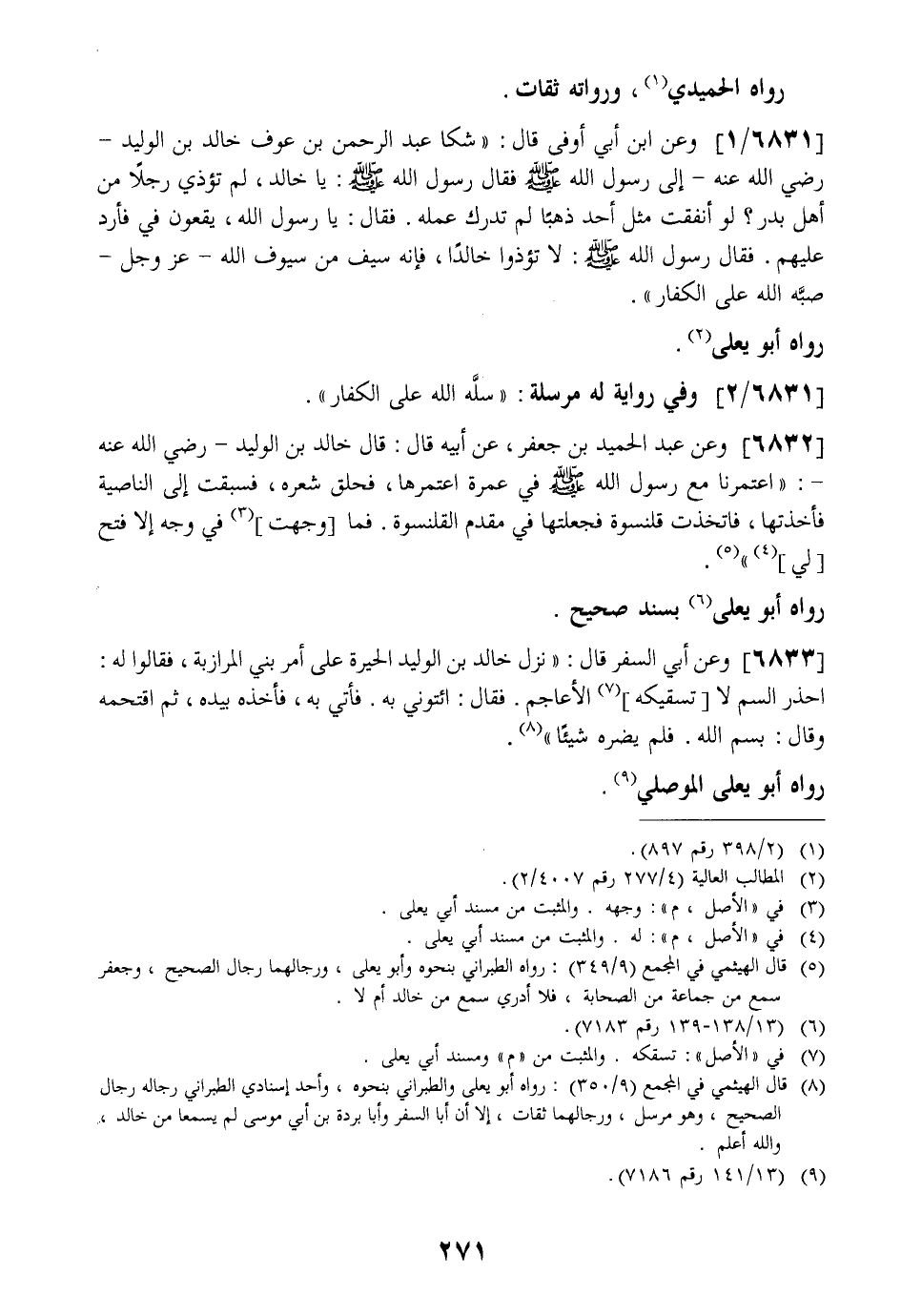 6831 / 1 - وَعَنِ ابْنِ أَبِي أوفى قال: " شكا عَبْدُ الرَّحْمَنِ بْنُ عَوْفٍ خَالِدَ بْنَ الْوَلِيدِ- رَضِيَ اللَّهُ عَنْهُ- إِلَى رَسُولِ اللَّهِ - صَلَّى اللَّهُ عَلَيْهِ وَسَلَّمَ - فَقَالَ رَسُولُ اللَّهِ - صَلَّى اللَّهُ عَلَيْهِ وَسَلَّمَ - يَا خَالِدُ لِمَ تُؤْذِي رَجُلًا مِنْ أَهْلِ بَدْرٍ؟ لَوْ أَنْفَقْتَ مِثْلَ أُحُدٍ ذَهَبًا لَمْ تُدْرِكْ عَمَلَهُ. فَقَالَ: يَا رَسُولَ اللَّهِ يَقَعُونَ فِيَّ فَأَرُدُّ عَلَيْهِمْ. فَقَالَ رَسُولُ اللَّهِ - صَلَّى اللَّهُ عَلَيْهِ وَسَلَّمَ -: لَا تُؤْذُوا خَالِدًا فَإِنَّهُ سَيْفٌ مِنْ سُيُوفِ اللَّهِ- عَزَّ وَجَلَّ- صبَّه اللَّهُ عَلَى الْكُفَّارِ".