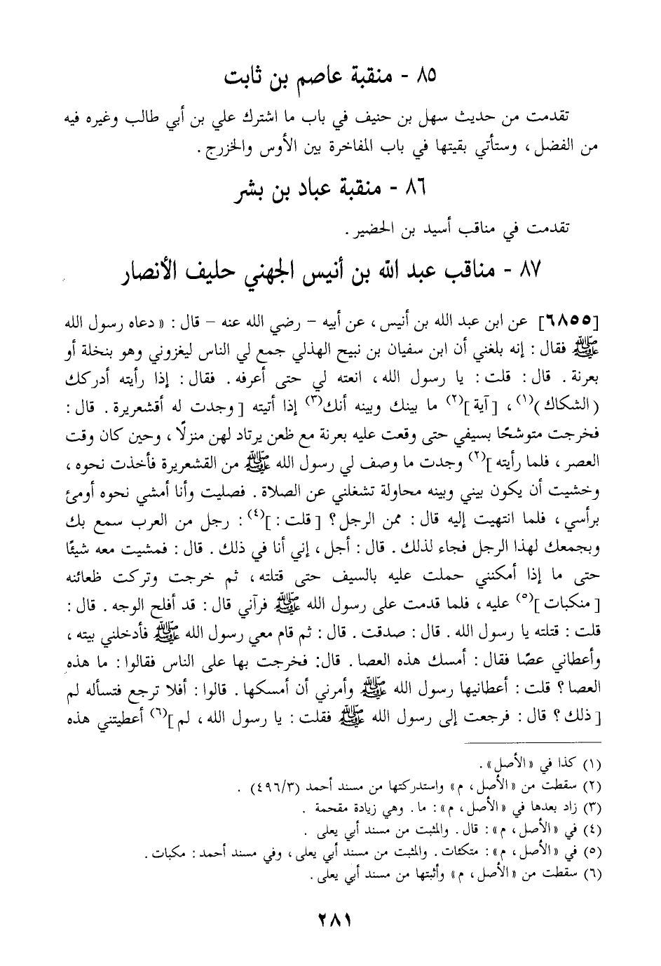 6855 - عَنِ ابْنِ عَبْدِ اللَّهِ بْنِ أُنَيْسٍ عَنْ أَبِيهِ- رَضِيَ اللَّهُ عَنْهُ- قَالَ: " دَعَاهُ رَسُولُ اللَّهِ - صَلَّى اللَّهُ عَلَيْهِ وَسَلَّمَ - فَقَالَ: إِنَّهُ بَلَغَنِي أَنَّ ابْنَ سُفْيَانَ بْنَ نُبَيْحٍ الْهُذَلِيَّ جُمِعَ لي النَّاسُ لِيَغْزُوَنِي وَهُوَ بِنَخْلَةٍ أَوْ بِعَرْنَةٍ. قَالَ: قُلْتُ: يَا رَسُولَ اللَّهِ انْعَتْهُ لِي حَتَّى أعرفه. فقال: إذا رأيته أدركك (الشكاك) آية ما بينك وبينه أنك إذا أتيته وجدت له أقشعريرة. قال: فخرجت متوشحًا بسيفي حتى وقعت عليه بعرنة مع ظعن يرتاد لهن منزلًا وحين كان وقت العصر فلما رأيته وجدت ما وصفه لِي رَسُولُ اللَّهِ - صَلَّى اللَّهُ عَلَيْهِ وَسَلَّمَ - مِنَ الْقَشْعَرِيرَةِ فَأَخَذْتُ نَحْوَهُ وَخَشِيتُ أَنْ يَكُونَ بَيْنِي وَبَيْنَهُ مُحَاوَلَةٌ تَشْغَلُنِي عَنِ الصَّلَاةِ. فَصَلَّيْتُ وَأَنَا أَمْشِي نَحْوَهُ أُومِئُ بِرَأْسِي فَلَمَّا انْتَهَيْتُ إليه قال: ممن الرجل؟ قلت: رجل من العرب سمع بك وبجمعك ل هذا الرجل فجاء لِذَلِكَ. قَالَ: أَجَلٌ إِنِّي أَنَا فِي ذَلِكَ. قال: فَمشَيْتُ مَعَهُ شَيْئًا حَتَّى مَا إِذَا أَمْكَنَنِي حَمَلْتُ عَلَيْهِ بِالسَّيْفِ حَتَّى قَتَلْتُهُ ثُمَّ خَرَجْتُ وَتَرَكْتُ ظَعَائِنَهُ مُنْكَبَّاتٍ عَلَيْهِ فَلَمَّا قَدِمْتُ عَلَى رَسُولِ اللَّهِ - صَلَّى اللَّهُ عَلَيْهِ وَسَلَّمَ - فَرَآنِي قَالَ: قَدْ أَفْلَحَ الْوَجْهُ. قَالَ: قُلْتُ: قَتَلْتُهُ يَا رَسُولَ اللَّهِ قَالَ: صَدَقْتَ. قَالَ: ثُمَّ قَامَ مَعِي رَسُولُ اللَّهِ - صَلَّى اللَّهُ عَلَيْهِ وَسَلَّمَ - فَأَدْخَلَنِي بَيْتَهُ وَأَعْطَانِي عَصًا فَقَالَ: أَمْسِكْ هَذِهِ الْعَصَا. قَالَ: فَخَرَجْتُ بِهَا عَلَى النَّاسِ فَقَالُوا: مَا هذه الْعَصَا؟ قُلْتُ: أَعْطَانِيهَا رَسُولُ اللَّهِ - صَلَّى اللَّهُ عَلَيْهِ وَسَلَّمَ - وَأَمَرَنِي أَنْ أُمْسِكَهَا. قَالُوا: أَفَلَا تَرْجِعُ فَتَسْأَلُهُ لِمَ ذلك؟ قال: فَرَجَعْتُ إِلَى رَسُولِ اللَّهِ - صَلَّى اللَّهُ عَلَيْهِ وَسَلَّمَ - فقلت: يا رسول الله لم أعطيتني هذه