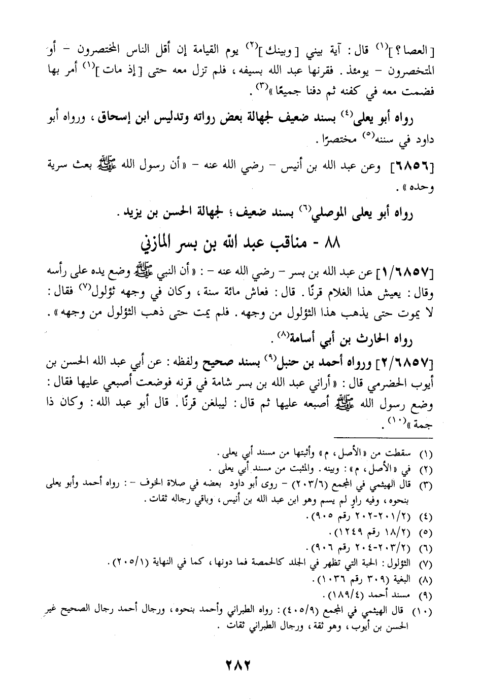 6857 / 2 - ورَوَاهُ أَحْمَدُ بْنُ حَنْبَلٍ بِسَنَدٍ صَحِيحٍ وَلَفْظُهُ: عن أبي عبد الله الحسن بْنِ أَيُّوبَ الْحَضْرَمِيِّ قَالَ: أَرَانِي عَبْدُ اللَّهِ بْنُ بِسْرٍ شَامَةً فِي قَرْنِهِ فَوَضَعْتُ أُصْبُعِي عَلَيْهَا فَقَالَ: وَضَعَ رَسُولُ اللَّهِ - صَلَّى اللَّهُ عَلَيْهِ وَسَلَّمَ - أُصْبُعَهُ عَلَيْهَا ثُمَّ قَالَ: لَيَبْلُغَنَّ قَرْنًا. قَالَ أَبُو عَبْدِ اللَّهِ: وَكَانَ ذَا جمة".