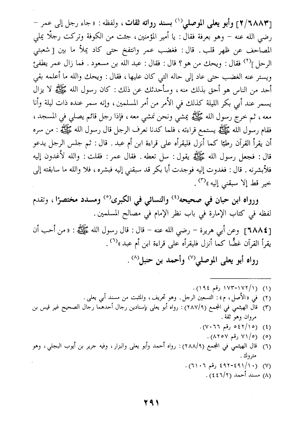 6883 / 2 - وَأَبُو يَعْلَى الْمَوْصِلِيُّ بِسَنَدٍ رُوَاتُهُ ثِقَاتٌ وَلَفْظُهُ: " جَاءَ رَجُلٌ إِلَى عُمَرَ- رَضِيَ اللَّهِ عَنْهُ- وَهُوَ بِعَرَفَةَ فَقَالَ: يَا أَمِيرَ الْمُؤْمِنِينَ جِئْتُ مِنَ الْكُوْفَةِ وَتَرَكْتُ رَجُلًا يُمْلِي الْمَصَاحِفَ عَنْ ظهر قلب. قَالَ: فَغَضِبَ عُمَرَ وَانْتَفَخَ حَتَّى كَادَ يَمْلَأَ ما بين شعبتي الرَّحْلُ فَقَالَ: وَيْحَكَ مَنْ هُوَ؟ قَالَ فَقَالَ: عَبْدُ اللَّهِ بْنُ مَسْعُودٍ. فَمَا زَالَ عُمَرُ يُطْفِئُ وَيَسْتُرُ عَنْهُ الْغَضَبَ حَتَّى عَادَ إِلَى حَالِهِ الَّتِي كَانَ عَلَيْهَا فَقَالَ: وَيْحَكَ وَاللَّهِ مَا أَعْلَمُهُ بَقِيَ أَحَدٌ مِنَ النَّاسِ هُوَ أَحَقُّ بِذَلِكُ مِنْهُ وَسَأُحَدِّثُكَ عَنْ ذَلِكَ: كَانَ رَسُولُ اللَّهِ - صَلَّى اللَّهُ عَلَيْهِ وَسَلَّمَ - لا يَزَالُ يَسْمُرُ عِنْدَ أَبِي بَكْرٍ اللَّيْلَةَ كَذَلِكَ فِي الْأَمْرِ مِنْ أَمْرِ الْمُسْلِمِينَ وَإِنَّهُ سَمُرَ عِنْدَهُ ذَاتَ لَيْلَةِ وَأَنَا مَعَهُ ثُمَّ خَرَجَ رَسُولُ اللَّهِ - صَلَّى اللَّهُ عَلَيْهِ وَسَلَّمَ - يَمْشِي وَنَحْنُ نَمْشِي مَعَهُ فَإِذَا رَجُلٌ قَائِمٌ يُصَلِّي فِي الْمَسْجِدِ فَقَامَ رَسُولُ اللَّهِ - صَلَّى اللَّهُ عَلَيْهِ وَسَلَّمَ - يَسْتَمِعُ قِرَاءَتُهُ فَلَمَّا كِدْنَا نَعْرِفُ الرَّجُلَ قَالَ رَسُولُ اللَّهِ - صَلَّى اللَّهُ عَلَيْهِ وَسَلَّمَ -: مَنْ سَرَّهُ أَنْ يَقْرَأَ الْقُرْآنَ رَطْبًا كَمَا أُنْزِلَ فَلْيَقْرَأْهُ عَلَى قِرَاءَةِ ابْنِ أُمِّ عَبْدٍ. قَالَ: ثُمَّ جَلَسَ الرَّجُلُ يَدْعُو قَالَ: فَجَعَلَ رَسوُلُ اللَّهِ - صَلَّى اللَّهُ عَلَيْهِ وَسَلَّمَ - يَقُولُ: سَلْ تُعْطَهْ. فَقَالَ عُمَرُ: فَقُلْتُ: وَاللَّهِ لأغدون إليه فلأبشرنه. قَالَ: فَغَدَوْتُ إِلَيْهِ فَوَجَدْتُ أَبَا بَكْرٍ قَدْ سَبَقَنِي إِلَيْهِ فَبَشَّرَهُ فَلَا وَاللَّهِ مَا سَابَقْتُهُ إِلَى خَيْرٍ قَطُّ إِلَّا سَبَقَنِي إِلَيْهِ ".