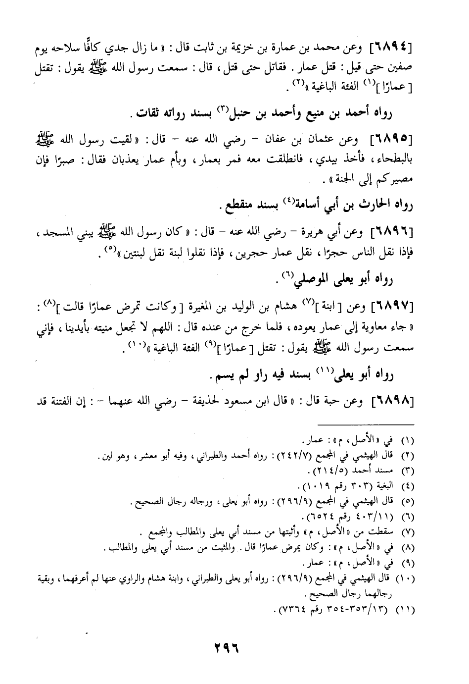 6894 - وَعَنْ مُحَمَّدِ بْنِ عُمَارَةَ بْنِ خُزَيْمَةَ بْنِ ثَابِتٍ قَالَ: " مَا زَالَ جَدِّي كَافًّا سِلَاحَهُ يَوْمَ صِفِّينَ حَتَّى قِيلَ: قُتِلَ عَمَّارٌ. فَقَاتَلَ حَتَّى قُتِلَ قَالَ: سَمِعْتُ رَسُولَ اللَّهِ - صَلَّى اللَّهُ عَلَيْهِ وَسَلَّمَ - يَقُولُ: تَقْتُلُ عَمَّارًا الْفِئَةُ الْبَاغِيَةُ ".