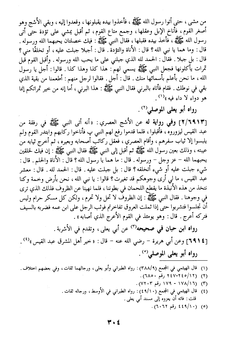 مَنْ مَشَى حَتَّى أَتَوْا رَسُولَ اللَّهِ - صَلَّى اللَّهُ عَلَيْهِ وَسَلَّمَ - فَأَخَذُوا بِيَدِهِ يُقَبِّلُونَهَا وَقَعَدُوا إِلَيْهِ وَبَقُي الْأَشَجُّ وَهُوَ أَصْغَرُ الْقَوْمِ فَأَنَاخَ الْإِبِلَ وَعَقَلَهَا وَجَمَعَ مَتَاعَ الْقَوْمِ ثُمَّ أَقْبَلَ يَمْشِي عَلَى تَؤُدَّةٍ حَتَّى أَتَى رَسُولَ اللَّهِ - صَلَّى اللَّهُ عَلَيْهِ وَسَلَّمَ - فَأَخَذَ بِيَدِهِ فَقَبَّلَهَا فَقَالَ النَّبِيُّ - صَلَّى اللَّهُ عَلَيْهِ وَسَلَّمَ -: فِيكَ خصلتان يحبهما لله وَرَسُولُهُ. قَالَ: وَمَا هُمَا يَا نَبِيَّ اللَّهِ؟ قَالَ: الْأَنَاةُ وَالتَّؤُدَّةِ. قَالَ: أَجَبْلًا جُبِلْتُ عَلَيْهِ أَوْ تَخَلُّقًا مِنِّي؟ قَالَ: بَلْ جَبْلًا. فَقَالَ: الْحَمْدُ للَّهِ الَّذِي جَبَلَنِي عَلَى مَا يُحِبُّ اللَّهُ وَرَسُولُهُ. وَأَقْبَلَ الْقَوْمُ قِبَلَ تَمَرَاتٍ يَأْكُلُونَهَا فَجَعَلَ النَّبِيُّ - صَلَّى اللَّهُ عَلَيْهِ وَسَلَّمَ - يُسَمِّي لَهُمْ: هَذَا كَذَا وَهَذَا كَذَا. قَالُوا: أَجَلْ يَا رَسُولَ اللَّهِ مَا نَحْنُ بِأَعْلَمَ بِأَسْمَائِهَا مِنْكَ. قَالَ: أَجَلْ. فَقَالُوا لِرَجُلٍ مِنْهُمْ: أَطْعِمْنَا مِنْ بَقِيَّةِ الَّذِي بَقِيَ فِي نُوْطِكَ. فَقَامَ فَأَتَاهُ بِالْبَرْنِيِّ فَقَالَ النَّبِيُّ - صَلَّى اللَّهُ عَلَيْهِ وَسَلَّمَ -: هَذَا البرني أم إنه من خير تمراتكم إنما هودواء لاداء فِيهِ".
