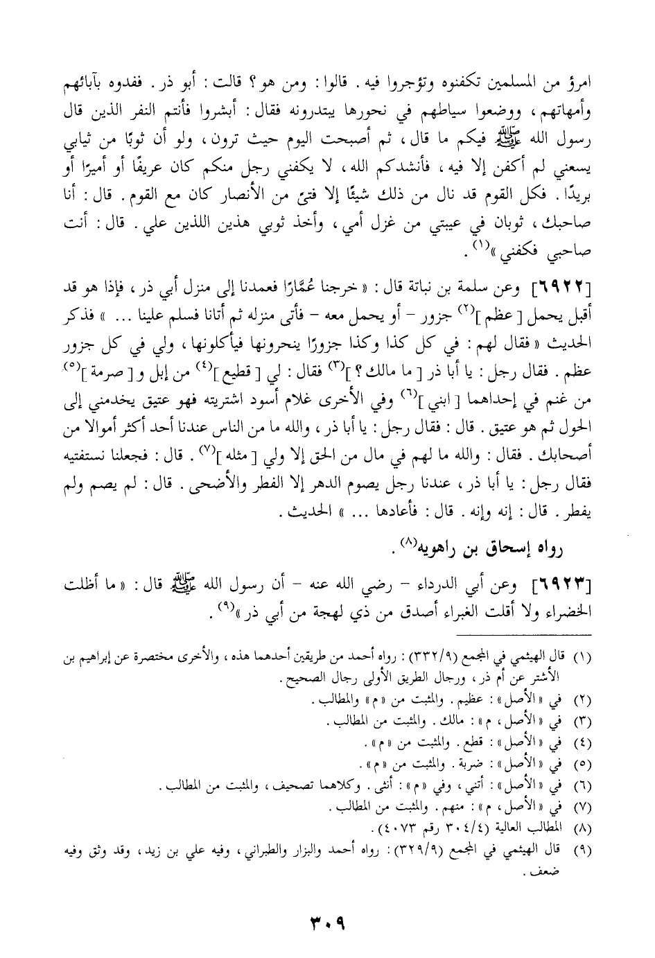 6922 - وَعَنْ سَلَمَةَ بْنِ نُبَاتَةَ قَالَ: " خَرَجْنَا عُمَّارًا فَعَمِدْنَا إِلَى مَنْزِلِ أَبِي ذَرٍّ فَإِذَا هُوَ قَدْ أقبل يحمل عظم جزور- أو يحمل مَعَهُ- فَأَتَى مَنْزِلَهُ ثُمَّ أَتَانَا فَسَلَّمَ عَلَيْنَا ... " فَذَكَرَ الْحَدِيثَ " فَقَالَ لَهُمْ: فِي كُلِّ كَذَا وكذا جزورًا يَنْحَرُونَهَا فَيَأْكُلُونَهَا وَلِي فِي كُلُّ جَزُورٍ عَظْمٌ. فقال رجل: يا أبا ذر ما مالك؟ فقال: لي أقطيع من إبل وأصرمة مِنَ غَنَمٍ فِي إِحْدَاهِمَا ابْنِي وَفِي الْأُخْرَى غُلَامٌ أَسْوَدُ اشْتَرَيْتُهُ فَهُوَ عَتِيقٌ يَخْدِمُنِي إِلَى الْحَوْلِ ثُمَّ هُوَ عَتِيقٌ. قَالَ فَقَالَ رَجُلٌ: يَا أَبَا ذَرٍّ وَاللَّهِ مَا مِنَ النَّاسِ عِنْدَنَا أَحَدٌ أَكْثَرَ أَمْوَالًا مِنْ أَصْحَابِكَ. فَقَالَ: وَاللَّهِ مَا لَهُمْ فِي مَالٍ مِنَ الْحَقِّ إلا ولي مثله. قَالَ: فَجَعَلْنَا نَسْتَفْتِيهِ فَقَالَ رَجُلٌ: يَا أَبَا ذَرٍّ عِنْدَنَا رَجُلٌ يَصُومُ الدَّهْرَ إِلَّا الْفِطْرَ وَالْأَضْحَى. قَالَ: لَمْ يَصُمْ وَلَمْ يُفْطِرْ. قَالَ: إنه وإنه. قَالَ: فَأَعَادَهَا ... " الْحَدِيثَ.