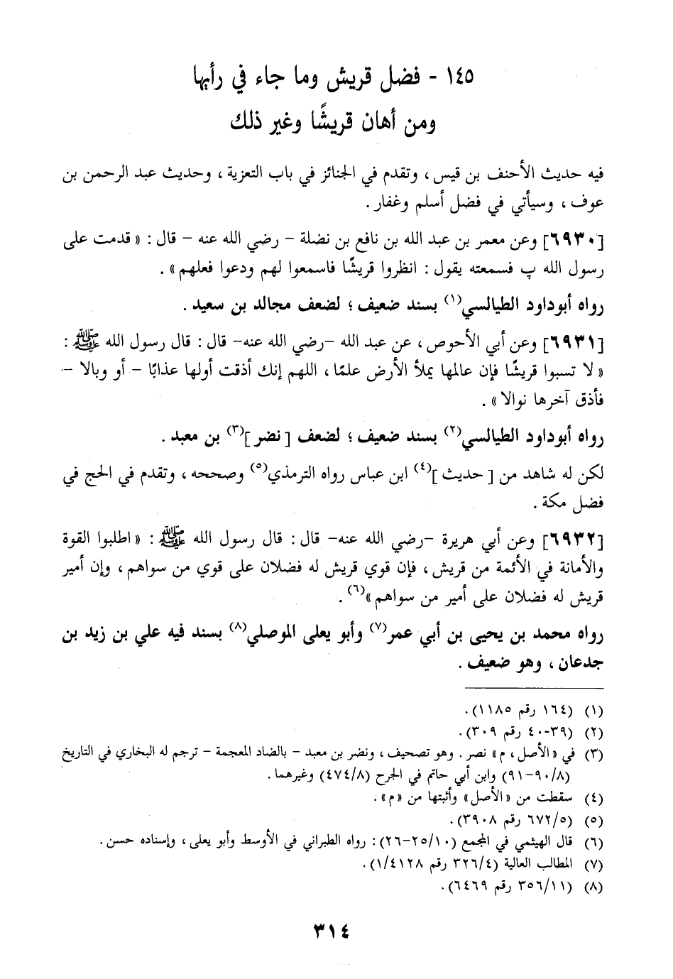 6931 - وَعَنِ أَبِي الْأَحْوَصِ عَنْ عَبْدِ اللَّهِ- رَضِيَ اللَّهُ عَنْهُ- قَالَ: قال رسول الله: " لَا تَسُبُّوا قُرَيْشًا فَإِنَّ عَالِمَهَا يَمْلَأُ الْأَرْضَ عِلْمًا اللَّهُمَّ إِنَّكَ أَذَقْتَ أَوَّلَهَا عَذَابًا- أَوْ وَبَالًا- فَأَذِقْ آخِرَهَا نَوَالًا ".