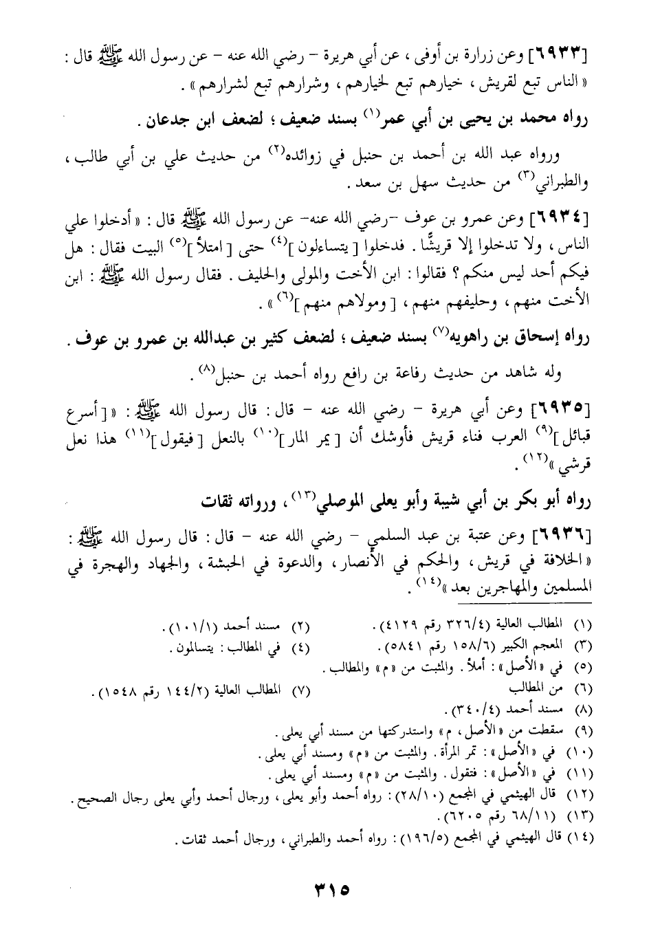 6934 - وَعَنْ عَمْرِو بْنِ عَوْفٍ- رَضِيَ اللَّهُ عَنْهُ- عَنْ رَسُولِ اللَّهِ - صَلَّى اللَّهُ عَلَيْهِ وَسَلَّمَ - قَالَ: "أَدْخِلُوا عَلَيَّ النَّاسَ وَلَا تُدْخِلُوا إِلَّا قُرَيْشًا. فَدَخَلُوا يَتَسَاءَلُونَ حَتَّى امتلأ الْبَيْتُ فَقَالَ: هَلْ فِيكُمْ أَحَدٌ لَيْسَ مِنْكُمْ؟ فَقَالُوا: ابنُ الْأَخْتِ وَالْمَوْلَى وَالْحَلِيفُ. فَقَالَ رَسُولُ اللَّهِ - صَلَّى اللَّهُ عَلَيْهِ وَسَلَّمَ -: ابن الأخت منهم وحليفهم منهم ومولاهم مِنْهُمْ ".