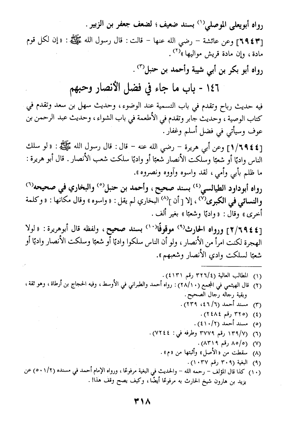 6944 / 2 - وَرَوَاهُ الْحَارِثُ مَوْقُوفًا بِسَنَدٍ صَحِيحٍ، وَلَفْظُهُ قَالَ أَبُو هُرَيْرَةَ: لَوْلَا الْهِجْرَةُ لَكُنْتُ امْرَأً مِنَ الْأَنْصَارِ، وَلَوْ أَنَّ النَّاسَ سَلَكُوا وَادِيًا أَوْ شِعْبًا وسلكت الأنصار واديًا أو شعبًا لَسَلَكْتُ وَادِيَ الْأَنْصَارِ وَشِعْبَهُمْ ".