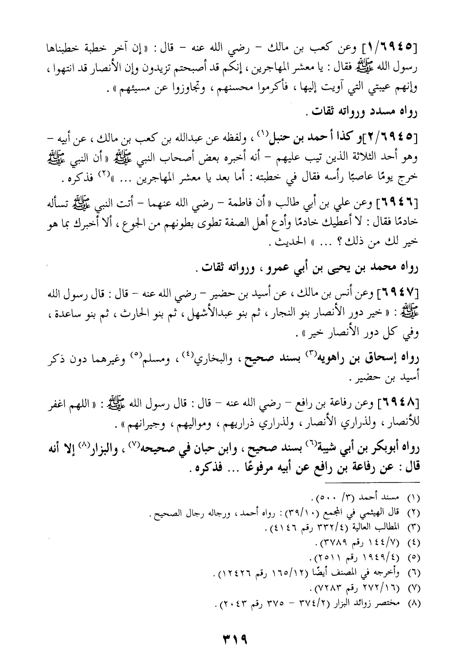 6945 / 2 - وَكَذَا أَحْمَدُ بْنُ حَنْبَلٍ، وَلَفْظُهُ عن عبدلله بْنِ كَعْبِ بْنِ مَالِكٍ، عَنْ أَبِيهِ- وَهُوَ أَحَدُ الثَّلَاثَةِ الَّذِينَ تِيبَ عَلَيْهِمْ- أَنَّهُ أَخْبَرَهُ بَعْضِ أَصْحَابِ النَّبِيِّ - صَلَّى اللَّهُ عَلَيْهِ وَسَلَّمَ - أَنَّ النَّبِيَّ - صَلَّى اللَّهُ عَلَيْهِ وَسَلَّمَ - خَرَجَ يومًا عاصبًا رأسه فقال في خطبته: أمابعد يَا مَعْشَرَ الْمُهَاجِرِينَ ... " فَذَكَرَهُ.