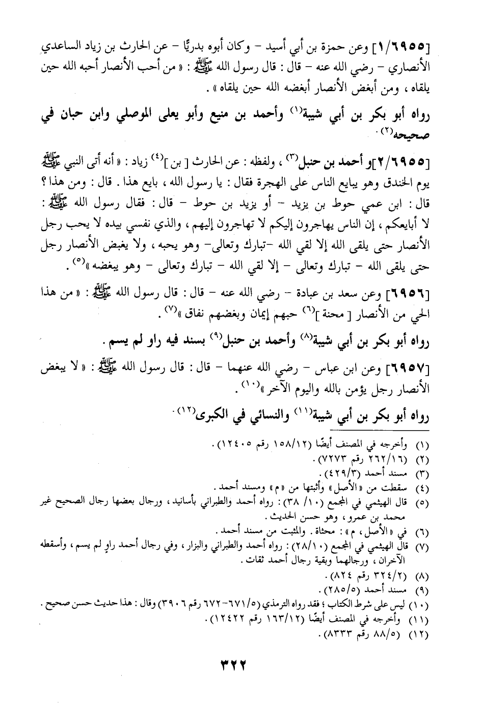 6955 / 2 - وَأَحْمَدُ بْنُ حَنْبَلٍ، وَلَفْظُهُ: عَنِ الْحَارِثِ بْنِ، زِيَادٍ: " أَنَّهُ أَتَى النَّبِيَّ - صَلَّى اللَّهُ عَلَيْهِ وَسَلَّمَ - يَوْمَ الْخَنْدَقِ وَهُوَ يُبَايِعُ النَّاسَ عَلَى الْهِجْرَةِ فَقَالَ: يا رسول الله، بايع هذا. قَالَ؟ وَمَنْ هَذَا؟ قَالَ: ابْنُ عَمِّي حَوْطُ بْنُ يَزِيدَ- أَوْ يَزِيدُ بْنُ حَوْطٍ- قَالَ: فَقَالَ رَسُولُ اللَّهِ - صَلَّى اللَّهُ عَلَيْهِ وسلم -: لَا أُبَايِعُكُمْ، إِنَّ النَّاسَ يُهَاجِرُونَ إِلَيْكُمْ لَا تُهَاجِرُونَ إِلَيْهِمْ، وَالَّذِي نَفْسِي بِيَدِهِ لَا يُحِبُّ رَجُلٌ الْأَنْصَارَ حَتَّى يَلْقَى اللَّهُ إِلَّا لَقِيَ الله- تبارك وتعالى- وهو يحبه، ولا يغبض الْأَنْصَارَ رَجُلٌ حَتَّى يَلْقَى اللَّهَ- تَبَارَكَ وَتَعَالَى- إِلَّا لَقِيَ اللَّهَ- تَبَارَكَ وَتَعَالَى- وَهُوُ يُبْغِضُهُ ".