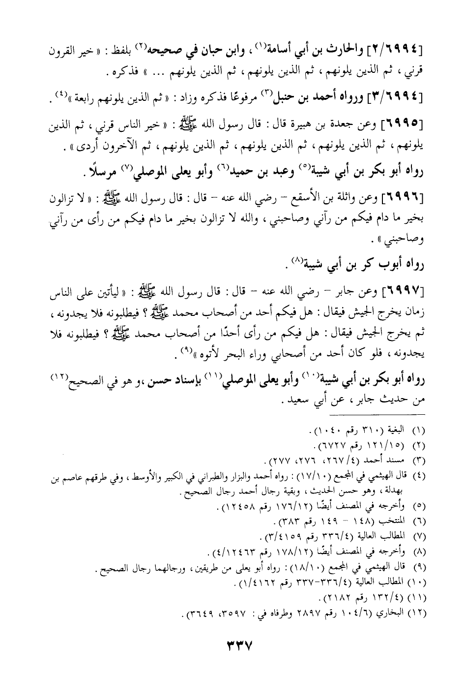 6994 / 2 - وَالْحَارِثُ بْنُ أَبِي أُسَامَةَ وَابْنُ حِبَّانَ فِي صَحِيحِهِ بِلَفْظِ: " خَيْرِ الْقُرُونِ قَرْنِي ثُمَّ الَّذِينَ يَلُونَهُمْ ثُمَّ الَّذِينَ يَلُونَهُمْ ثُمَّ الَّذِينَ يَلُونَهُمْ ... " فَذَكَرَهُ.