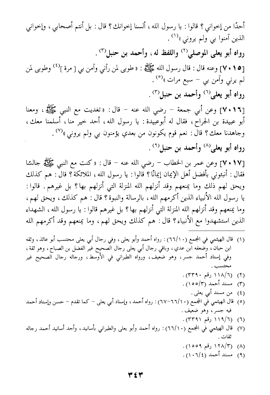 7016 - وَعَنْ أَبِي جُمُعَةَ- رَضِيَ اللَّهُ عَنْهُ- قَالَ: "تَغَدَّيْتُ مَعَ النَّبِيِّ - صَلَّى اللَّهُ عَلَيْهِ وَسَلَّمَ -، وَمَعَنَا أَبُو عُبَيْدَةَ بْنُ الْجَرَّاحِ، فَقَالَ لَهُ أَبُو عبيدة: يَا رَسُولَ اللَّهِ - صَلَّى اللَّهُ عَلَيْهِ وَسَلَّمَ -، أَحَدٌ خَيْرٌ مِنَّا، أَسْلَمْنَا مَعَكَ، وَجَاهَدْنَا مَعَكَ؟ قَالَ: نَعَمْ قَوْمٌ يَكُونُونَ مِنْ بَعْدِي يُؤْمِنُونَ بِي وَلَمْ يَرَوْنِي ".