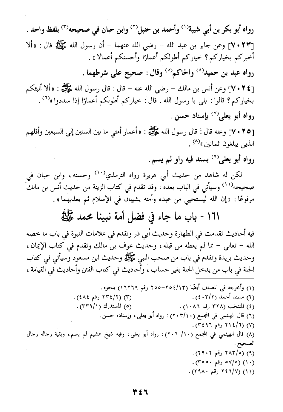7023 - وَعَنْ جَابِرِ بْنِ عَبْدِ اللَّهِ- رَضِيَ اللَّهُ عَنْهُمَا- أن رسول الله - صلى الله عَلَيْهِ وَسَلَّمَ - قَالَ: أَلَا أُخْبِرُكُمْ بِخِيَارِكُمْ؟ خِيَارُكُمْ أَطْوَلُكُمْ أَعْمَارًا وَأَحْسَنُكُمْ أَعْمَالًا ".