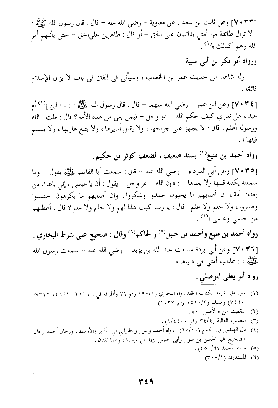 7033 - وَعَنْ ثَابِتِ بْنِ سَعْدٍ، عَنْ مُعَاوِيَةَ- رَضِيَ اللَّهُ عَنْهُ- قَالَ: قَالَ رَسُولُ اللَّهِ - صَلَّى اللَّهُ عَلَيْهِ وَسَلَّمَ -: " لَا تَزَالُ طَائِفَةٌ مِنْ أُمَّتِي يُقَاتِلُونَ عَلَى الْحَقِّ- أَوْ قَالَ: ظَاهِرِينَ عَلَى الْحَقِّ- حَتَّى يَأْتِيَهُمْ أَمْرُ اللَّهِ وَهُمْ كذلك".
