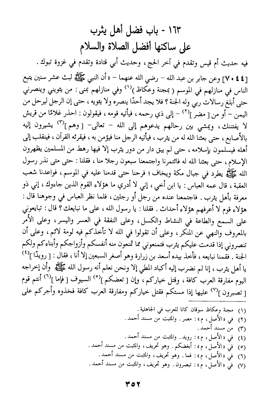 7045 - وَعَنْ جَابِرِ بْنِ عَبْدِ اللَّهِ- رَضِيَ اللَّهُ عَنْهُمَا- " أَنَّ النَّبِيَّ - صَلَّى اللَّهُ عَلَيْهِ وَسَلَّمَ - لَبِثَ عَشْرَ سِنِينَ يَتْبَعُ النَّاسَ فِي مَنَازِلِهِمْ فِي الْمَوْسِمِ (بِمِجَنَّةَ وَعُكَاظَ) وَفِي مَنَازِلِهِمْ بِمِنًى مَنْ يُئْوِينِي وَيَنْصُرُنِي حَتَّى أُبَلِّغَ رِسَالَاتِ رَبِّي وَلَهُ الْجَنَّةُ؟ فَلَا يَجِدُ أَحَدًا يَنُصُرُهُ وَلَا يُئْوِيهِ، حَتَّى أَنَّ الرَّجُلَ لَيَرْحَلُ مِنَ الْيَمَنِ- أَوْ مِنْ مُضَرَ، - إِلَى ذِي رَحِمِهِ، فَيَأْتِيهِ قَوْمُهُ، فَيَقُولُونَ: احْذَرْ غلامًا من قريش لا يفتننك، وَيَمْشِي بَيْنَ رِحَالِهِمْ يَدْعُوهُمْ إِلَى اللَّهِ- تَعَالَى- وهم، يُشِيرُونَ إِلَيْهِ بِالْأَصَابِعِ، حَتَّى بَعَثَنَا اللَّهُ لَهْ من يثرب، فيأتيه الرجل منا فيؤمن بِهِ، فَيُقْرِئُهُ الْقُرْآنَ، فَيَنْقَلِبُ إِلَى أَهْلِهِ فَيُسْلِمُونَ بِإِسْلَامِهِ، حَتَّى لَمْ يَبْقَ دَارٌ مِنْ دُورِ يَثْرِبَ إِلَّا فِيهَا رَهْطٌ مِنَ الْمُسْلِمِينَ يُظْهِرُونَ الإسلام، حتى بعثنا الله له فائتمرنا وَاجْتَمَعْنَا سَبْعُونَ رَجُلًا مِنَّا، فَقُلْنَا: حَتَّى مَتَى نَذَرُ رَسُولَ اللَّهِ - صَلَّى اللَّهُ عَلَيْهِ وَسَلَّمَ - يُطْرَدُ فِي جِبَالِ مَكَّةَ وَيَخَافُ، فَرُحْنَا حَتَّى قَدِمْنَا عَلَيْهِ فِي الْمَوْسِمِ، فَوَاعَدَنَا شِعْبَ الْعَقَبَةِ، قال عمه العباس: يا ابن أخي، إني لَا أَدْرِي مَا هَؤُلَاءِ الْقَوْمُ الَّذِينَ جَاءُوكَ، إِنِّي ذُو مَعْرِفَةٍ بِأَهْلِ يَثْرِبَ. فَاجْتَمَعْنَا عِنْدَهُ مِنْ رَجُلٍ أَوْ رَجُلَيْنِ، فَلَمَّا نَظَرَ الْعَبَّاسُ فِي وُجُوْهِنَا قَالَ: هَؤُلَاءِ قَوْمٌ لَا أَعْرِفُهُمْ هؤلاء أحداث. فَقُلْنَا: يَا رَسُولَ اللَّهِ - صَلَّى اللَّهُ عَلَيْهِ وَسَلَّمَ -، على ما نبايعك؟ قال: تبايعوني عَلَى السَّمْعِ وَالطَّاعَةِ فِي النَّشَاطِ وَالْكَسَلِ، وَعَلَى النفقة في العسر واليسر، وَعَلَى الْأَمْرِ بِالْمَعْرُوفِ وَالنَّهْيِ عَنِ الْمُنْكَرِ، وَعَلَى أن تقولوا في الله لا تأخذكم فِيهِ لَوْمَةُ لَائِمٍ، وَعَلَى أَنْ تَنْصُرُونِي إِذَا قَدِمْتُ عَلَيْكُمْ يَثْرِبَ فَتَمْنَعُونِي مِمَّا تَمْنَعُونَ مِنْهُ أَنْفُسَكُمْ وَأَزْوَاجَكُمْ وَأَبْنَاءَكُمْ وَلَكُمُ الْجَنَّةُ. فَقُمْنَا نُبَايِعُهُ، فأخذ بيده أَسَعَدُ بْنُ زُرَارَةَ وَهُوَ أَصْغَرُ السَّبْعِينَ إِلَّا أَنَا، فَقَالَ: رُوَيْدًا، يَا أَهْلَ يَثْرِبَ، إِنَّا لَمْ نَضْرِبْ إِلَيْهِ أَكْبَادَ الْمَطِيِّ إِلَّا وَنَحْنُ نَعْلَمُ أَنَّهُ رَسُولُ اللَّهِ - صَلَّى اللَّهُ عَلَيْهِ وَسَلَّمَ - وَإِنْ إِخْرَاجَهُ الْيَوْمَ مُفَارَقَةُ الْعَرَبِ كَافَّةً، وَقَتْلُ خِيَارِكُمْ، وَأَنْ تَعَضَّكُمُ، السُّيُوفُ فَإِمَّا، أَنْتُمْ قَوْمٌ تَصْبِرُونَ، عَلَيْهَا إِذَا مَسَّتْكُمَ فَقَتْلُ خِيَارِكُمْ وَمُفَارَقَةُ الْعَرَبِ كَافَّةً فَخُذُوهُ وَأَجْرُكُمْ عَلَى