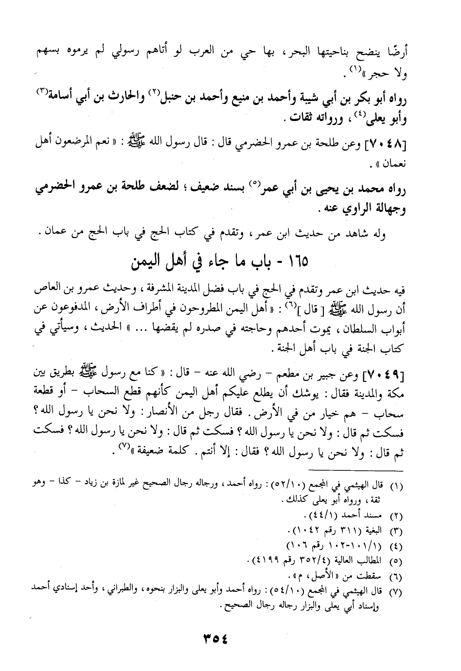 7049 - وَعَنْ جُبَيْرِ بْنِ مُطْعَمٍ- رَضِيَ اللَّهُ عَنْهُ- قَالَ: " كُنَّا مع الرسول - صَلَّى اللَّهُ عَلَيْهِ وَسَلَّمَ - بِطَرِيقٍ بَيْنَ مَكَّةَ وَالْمَدِينَةِ فَقَالَ: يُوشِكُ أَنْ يَطْلُعَ عَلَيْكُمْ أَهْلُ الْيَمَنِ كَأَنَّهُمْ قِطَعُ السَّحَابِ- أَوْ قِطْعَةُ سَحَابٍ- هُمْ خِيَارُ مَنْ فِي الْأَرْضِ. فَقَالَ رَجُلٌ من الأنصار: ولا نحن يَا رَسُولَ اللَّهِ - صَلَّى اللَّهُ عَلَيْهِ وَسَلَّمَ -؟ فسكت ثم قال: ولا نحن يَا رَسُولَ اللَّهِ - صَلَّى اللَّهُ عَلَيْهِ وَسَلَّمَ -؟ فسكت ثم قال: ولا نحن يَا رَسُولَ اللَّهِ - صَلَّى اللَّهُ عَلَيْهِ وَسَلَّمَ -؟ فسكت ثم قال: ولا نحن يَا رَسُولَ اللَّهِ - صَلَّى اللَّهُ عَلَيْهِ وَسَلَّمَ -؟ فقال: إِلَّا أَنْتُمْ. كَلِمَةٌ ضَعِيفَةٌ ".