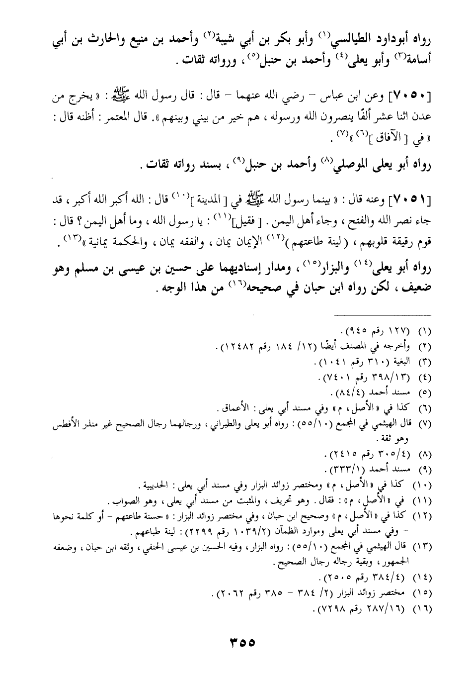 رَوَاهُ أَبُو دَاوُدَ الطَّيَالِسِيُّ وَأَبُو بَكْرِ بْنُ أَبِي شَيْبَةَ وَأَحْمَدُ بْنُ مَنِيعٍ وَالْحَارِثُ بْنُ أَبِي أُسَامَةَ وَأَبُو يَعْلَى وَأَحْمَدُ بْنُ حَنْبَلٍ، وَرُوَاتُهُ ثِقَاتٌ.