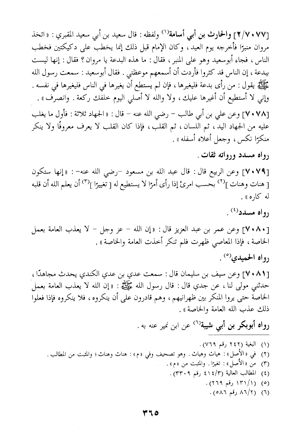 7077 / 2 - وَالْحَارِثُ بْنُ أَبِي أُسَامَةَ وَلَفْظُهُ: قَالَ سَعِيدُ بْنُ أَبِي سَعِيدٍ الْمَقْبُرِيُّ: اتْخَذَ مَرْوَانُ مِنْبَرًا فَأَخْرَجَهُ يَوْمَ الْعِيدِ، وَكَانَ الْإِمَامُ قَبْلَ ذَلِكَ إِنَّمَا يَخْطُبُ عَلَى دُكَيْكَتَيْنِ فَخَطَبَ النَّاسَ، فَجَاءَ أَبُو سَعِيدٍ وَهُوَ عَلَى الْمِنْبَرِ، فَقَالَ: مَا هذه البدعة يَا مَرْوَانُ؟ فَقَالَ: إِنَّهَا لَيْسَتْ بِبِدْعَةٍ، إِنَّ النَّاسَ قَدْ كَثُرُوا فَأَرَدْتُ أَنْ أُسْمِعَهُمْ مَوْعِظَتِي. فَقَالَ أَبُو سَعِيدٌ: سَمِعْتُ رَسُولَ اللَّهِ - صَلَّى اللَّهُ عَلَيْهِ وَسَلَّمَ - يَقُولُ: مَنْ رَأَى بِدْعَةً فَلْيُغَيِّرْهَا، فَإِنْ لَمْ يَسْتَطِعْ أَنْ يُغَيِّرَهَا فِي النَّاسِ فَلْيُغَيِّرَهَا فِي نفسهْ وَإِنِّي لَا أَسْتَطِيعُ أَنْ أُغَيِّرَهَا عَلَيْكَ، وَلَا وَاللَّهِ لَا أُصَلِّي الْيَوْمَ خَلْفَكَ رَكْعَةً. وَانْصَرَفَ ".