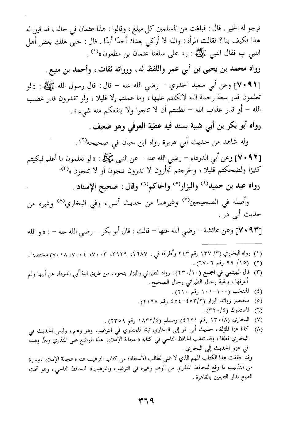 7092 - وَعَنْ أَبِي الدَّرْدَاءِ- رَضِيَ اللَّهُ عَنْهُ- عَنِ النَّبِيِّ - صَلَّى اللَّهُ عليه وسلم -: لَوْ تَعْلَمُونَ مَا أَعْلَمُ لَبَكَيْتُمْ كَثِيرًا وَلَضَحِكْتُمْ قَلِيلًا، وَلَخَرَجْتُمْ تَجْأَرُونَ لَا تَدْرُونَ تَنْجُونَ أَوْ لَا تَنْجُونَ "