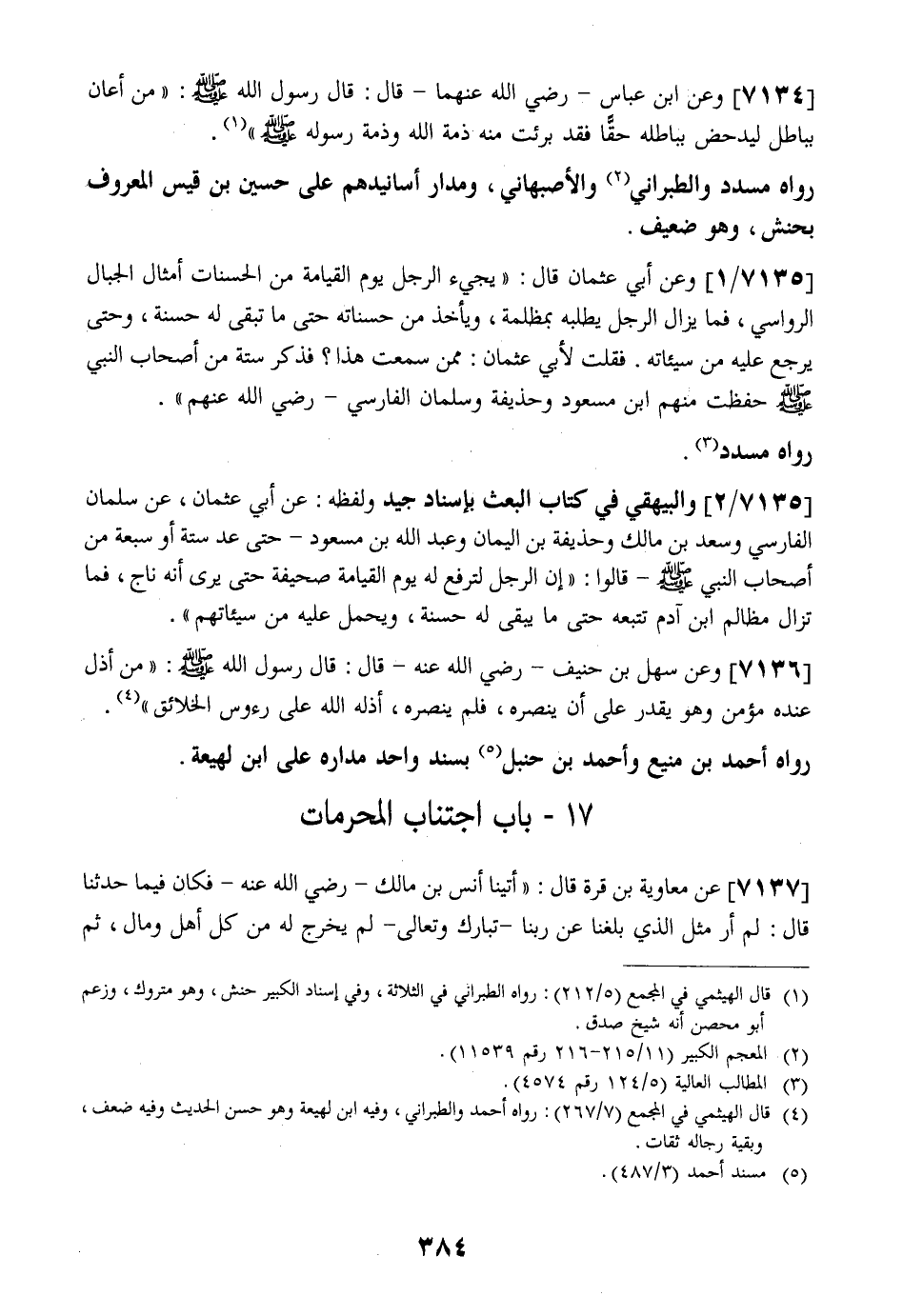 7135 / 1 - وَعَنْ أَبِي عُثْمَانَ قَالَ: " يَجِيءُ الرَّجُلُ يَوْمَ الْقِيَامَةِ مِنَ الْحَسَنَاتِ أَمَثَالُ الْجِبَالَ الرَّوَاسِيَ، فَمَا يَزَالُ الرَّجُلُ يَطْلُبُهُ بِمَظْلَمَةٍ، وَيَأْخُذُ مِنْ حَسَنَاتِهِ حَتَّى مَا تَبْقَى لَهُ حَسَنَةٌ، وَحَتَّى يُرْجَعُ عَلَيْهِ مِنْ سَيِّئَاتِهِ. فَقُلْتُ لِأَبِي عُثْمَانَ: مِمَّنْ سَمِعْتَ هذا؟ فذكر ستة مِنْ أَصْحَابِ النَّبِيِّ - صَلَّى اللَّهُ عَلَيْهِ وَسَلَّمَ - حَفِظْتُ مِنْهُمُ ابْنَ مَسْعُودٍ وَحُذَيْفَةَ وَسَلْمَانَ الْفَارِسِيَّ- رَضِيَ اللَّهُ عَنْهُمْ ".