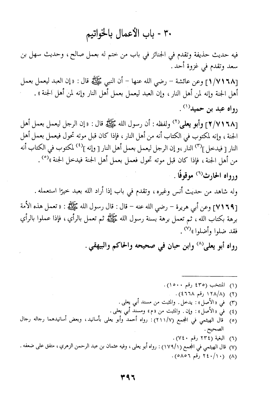 7168 / 2 - وَأَبُو يَعْلَى وَلَفْظُهُ: أَنَّ رَسُولَ اللَّهِ - صَلَّى اللَّهُ عَلَيْهِ وسلم - قال: " إِنَّ الرَّجُلَ لَيَعْمَلُ بِعَمَلِ أَهْلِ الْجَنَّةِ وَإِنَّهُ لَمَكْتُوبٌ فِي الْكِتَابِ أَنَّهُ مِنْ أَهْلِ النَّارِ فَإِذَا كَانَ قَبْلَ مَوْتِهِ تَحَوَّلَ فَيَعْمَلُ بِعَمَلِ أهل النارفيدخل النار وإن الرَّجُلَ لَيَعْمَلُ بِعَمَلِ أَهْلِ النَّارِ وَإِنَّهُ لَمَكْتُوبٌ فِي الْكِتَابِ أَنَّهُ مِنْ أَهْلِ الْجَنَّةِ فَإِذَا كَانَ قَبْلَ مَوْتِهِ تَحَوَّلَ فَعَمِلَ بِعَمَلِ أَهْلِ الْجَنَّةِ فَيَدْخُلُ الْجَنَّةَ ".