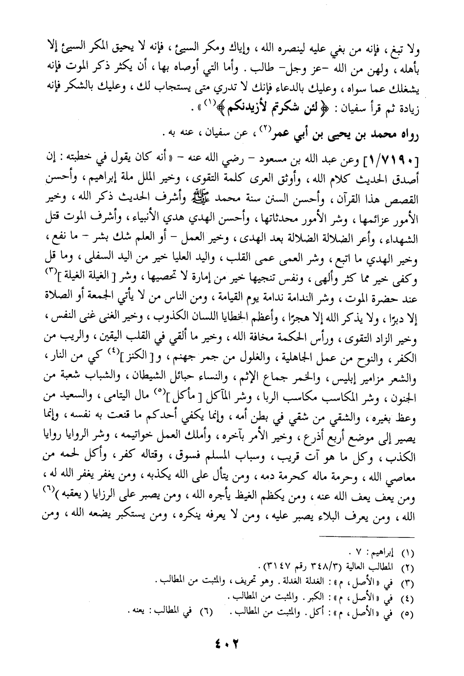 7190 / 1 - وَعَنْ عَبْدِ اللَّهِ بْنِ مَسْعُودٍ- رَضِيَ اللَّهُ عَنْهُ- "أَنَّهُ كَانَ يَقُولُ فِي خُطْبَتِهِ: إِنَّ أَصْدَقَ الْحَدِيثِ كَلَامُ اللَّهِ وَأَوْثَقَ الْعُرَى كَلِمَةُ التَّقْوَى وَخَيْرَ الْمِلَلِ مِلَّةُ إِبْرَاهِيمَ وَأَحْسَنَ الْقَصَصِ هَذَا الْقُرْآنُ وَأَحْسَنَ السُّنَنِ سُنَّةُ مُحَمَّدٍ - صَلَّى اللَّهُ عَلَيْهِ وَسَلَّمَ - وَأَشْرَفَ الْحَدِيثِ ذِكْرُ اللَّهِ وَخَيْرَ الْأُمُورِ عَزَائِمُهَا وَشَرَّ الْأُمُورِ مُحْدَثَاتُهَا وَأَحْسَنَ الْهَدْيِ هَدْيُ الْأَنْبِيَاءِ وأشرف الموت قتل الشهداء وأعر الضَّلَالَةِ الضَّلَالَةُ بَعْدَ الْهُدَى وَخَيْرَ الْعَمَلِ- أَوِ الْعِلْمِ شَكَّ بِشْرٌ- مَا نَفَعَ وَخَيْرَ الْهَدْيِ مَا اتُّبِعْ وَشَرَّ الْعَمَى عَمَى الْقَلْبِ وَالْيَدُ الْعُلْيا خَيْرٌ مِنَ الْيَدِ الْسُفْلَى وَمَا قَلَّ وَكَفَى خَيْرٌ مِمَّا كَثُرَ وَأَلْهَى وَنَفْسٌ تُنَّجِيهَا خير من إمارة لا تحصيها وشر الغيلة الغيلة عِنْدَ حَضْرَةِ الْمَوْتِ وَشَرُّ النَّدَامَةِ نَدَامَةُ يَوْمِ الْقِيَامَةِ وَمِنَ النَّاسِ مَنْ لَا يَأْتِي الْجُمُعَةَ أَوِ الصَّلَاةَ إِلَّا دُبُرًا وَلَا يَذْكُرُ اللَّهَ إلا هَجْرًا وَأَعْظَمُ الْخَطَايَا اللِّسَانُ الْكَذُوبُ وَخَيْرُ الْغِنَى غِنَى النَّفْسِ وَخَيْرُ الزَّادِ التَّقْوَى وَرَأْسُ الْحِكْمَةِ مَخَافَةُ اللَّهِ وَخَيْرُ مَا أُلْقِيَ فِي الْقَلْبِ الْيَقِينُ وَالرَّيْبُ مِنَ الْكُفْرِ وَالنَّوْحُ مِنْ عَمَلِ الجاهلية والغلول من جمر جهنم والكنز كَيٌّ مِنَ النَّارِ والشعر مَزَامِيرُ إِبْلِيسَ وَالْخَمْرُ جِمَاعُ الْإِثْمِ وَالنِّسَاءُ حَبَائِلُ الشَّيْطَانِ وَالشَّبَابُ شُعْبَةٌ من الجنون وشر المكاسب مكا سب الربا وشَر المآكل مأكل مَالِ الْيَتَامَى وَالسَّعِيدُ مَنْ وُعِظَ بِغَيْرِهِ وَالشَّقِيُّ من شقي في بطن أمه وإنما يَكْفِي أَحَدُكُمْ مَا قَنَعَتْ بِهِ نَفْسُهُ وَإِنَّمَا يَصِيرُ إِلَى مَوْضِعِ أَرْبَعِ أَذْرُعٍ وَخَيْرُ الْأَمْرِ بآخره وأملك العمل خواتيمه وَشَرُّ الرِّوَايَا رِوَايَا الْكَذِبِ وَكُلُّ مَا هُوَ آتِ قَرِيبٌ وَسِبَابُ الْمُسْلِمِ فُسُوقٌ وَقِتَالُهُ كُفْرٌ وَأَكْلُ لَحْمِهِ مِنْ مَعَاصِي اللَّهِ وَحُرْمَةُ مَالِهِ كَحُرْمَةِ دَمِهِ وَمَنْ يَتَألَّ عَلَى اللَّهِ يُكْذِبْهُ وَمَنْ يَغْفِرْ يَغْفِرِ اللَّهُ لَهُ وَمَنْ يَعْفُ يَعْفُ اللَّهُ عَنْهُ وَمَنْ يَكْظِمِ الْغَيْظَ يَأْجُرْهُ الله ومن يصبر عَلَى الرَّزَايَا (يُعْقِبُهُ) اللَّهُ وَمَنْ يَعْرِفِ الْبَلَاءَ يَصْبِرْ عَلَيْهِ وَمَنْ لَا يَعْرِفْهُ يُنْكِرْهُ وَمَنْ يستكبر يضعه الله ومن