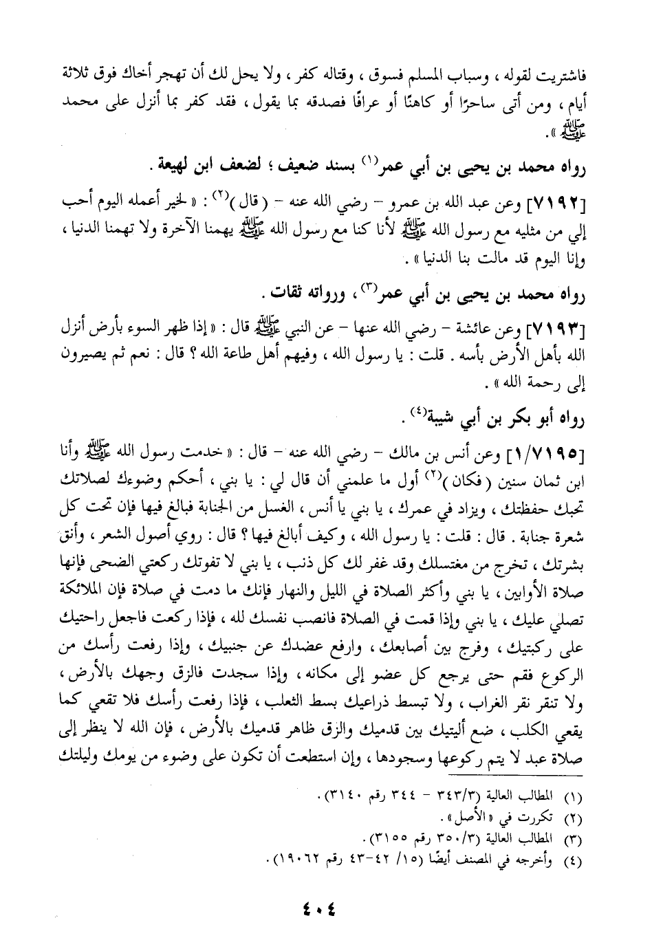 7194 / 1 - وَعَنِ أَنَسِ بْنِ مَالِكٍ- رَضِيَ اللَّهُ عَنْهُ- قَالَ: ((خَدَمْتُ رَسُولَ اللَّهِ - صَلَّى اللَّهُ عَلَيْهِ وَسَلَّمَ - وَأَنَا ابْنُ ثَمَانِ سِنِينَ (فَكَانَ) أَوَّلُ مَا عَلَّمَنِي أَنْ قَالَ لي: يا بني حكم وضوءك لصلاتك تحبك حفظتك ويزاد فِي عُمُرِكَ يَا بُنَيَّ يَا أَنَسُ الْغُسْلُ من الجنابة فبالغ فيها فإن تَحْتَ كُلِّ شَعْرَةٍ جَنَابَةٌ. قَالَ: قُلْتُ: يَا رسول الله (وكيف أبالغ فيها؟ قال: روي أصول الشعر وأنق بشرتك تخرج من مغتسلك وَقَدْ غُفِرَ لَكَ كُلُّ ذَنْبٍ يَا بُنَيَّ لَا تَفُوتُكَ رَكْعَتَيِ الضُّحَى فَإِنَّهَا صَلَاةُ الْأَوَّابِينَ يا بني وأكثر الصلاة في الليل والنهار فإنك ما دمت في صلاة فإن الملائكة تصلي عليك يَا بُنَيَّ وَإِذَا قُمْتَ فِي الصَّلَاةِ فَانْصُبْ نَفْسَكَ لِلَّهِ فَإِذَا رَكَعْتَ فَاجْعَلْ رَاحَتَيْكَ عَلَى ركبتيك وفرج بين أصابعك وارفع عضدك عَنْ جَنْبَيْكَ وَإِذَا رَفَعْتَ رَأْسَكَ مِنَ الرُّكُوعِ فَقُمْ حَتَّى يَرْجِعَ كُلُّ عُضْوٍ إِلَى مَكَانِهِ وَإِذَا سَجَدْتَ فَأَلْزِقْ وَجْهَكَ بِالْأَرْضِ وَلَا تَنْقُرْ نَقْرَ الْغُرَابِ وَلَا تَبْسُطُ ذِرَاعَيْكَ بَسْطَ الثَّعْلَبِ فإذا رفعت رأسك فلا تقعي كما يقعي الكلب ضع أليتيك بين قدميك والزق ظاهر قَدَمَيْكَ بِالْأَرْضِ فَإِنَّ اللَّهَ لَا يَنْظُرُ إِلَى صَلَاةِ عَبْدٍ لَا يُتِمُّ رُكُوْعَهَا وَسُجُودَهَا وَإِنِ اسْتَطَعْتَ أَنْ تَكُونَ عَلَى وُضُوءٍ مِنْ يَوْمِكَ وليلتك