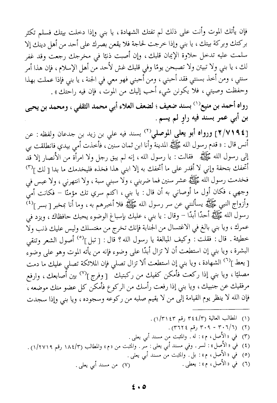 7194 / 2 - وَرَوَاهُ أَبُو يَعْلَى الْمَوْصِلِيُّ بِسَنَدٍ فِيهِ عَلِيُّ بْنُ زَيْدِ بْنِ جُدْعَانَ وَلَفْظُهُ: عَنْ أنس قَالَ: " قَدِمَ رَسُولُ اللَّهِ - صَلَّى اللَّهُ عَلَيْهِ وَسَلَّمَ - الْمَدِينَةَ وَأَنَا ابْنُ ثَمَانِ سِنِينَ فَأَخَذَتْ أُمِّي بِيَدِي فَانْطَلَقَتْ بِي إِلَى رَسُولِ اللَّهِ - صَلَّى اللَّهُ عَلَيْهِ وَسَلَّمَ - فَقَالَتْ: يَا رَسُولَ اللَّهِ إِنَّهُ لَمْ يَبْقَ رَجُلٌ وَلَا امْرَأَةٌ مِنَ الْأَنْصَارِ إِلَّا قَدْ أتحفك بِتُحْفَةٍ وَإِنِّي لَا أَقْدِرُ عَلَى مَا أُتْحِفُكَ بِهِ إِلَّا ابْنِي هَذَا فَخُذْهُ فَلْيَخْدِمْكَ مَا بَدَا لَكَ فَخَدَمْتُ رَسُولَ اللَّهِ - صَلَّى اللَّهُ عَلَيْهِ وَسَلَّمَ - عَشْرَ سِنِينَ فَمَا ضَرَبَنِي وَلَا سَبَّنِي سُبَّةً وَلَا انْتَهَرَنِي وَلَا عَبَسَ فِي وَجْهِي فَكَانَ أول ما أوصاني به قَالَ: يَا بُنَيَّ اكْتُمْ سِرِّي تَكُ مُؤْمِنًا- فكانت أمي وأزواج النبي - صَلَّى اللَّهُ عَلَيْهِ وَسَلَّمَ - يَسْأَلْنَنِي عَنْ سِرِّ رَسُولِ اللَّهِ - صَلَّى اللَّهُ عَلَيْهِ وَسَلَّمَ - فَلَا أُخْبِرُهُمْ بِهِ وَمَا أَنَا بمخبربسر رَسُولِ اللَّهِ - صَلَّى اللَّهُ عَلَيْهِ وَسَلَّمَ - أَحَدًا أَبَدًا- وَقَالَ: يَا بُنَيَّ عَلَيْكَ بِإِسْبَاغِ الْوُضُوءِ يحبك حافظاك ويزد في عُمُرُكَ وَيَا بُنَيَّ بَالِغْ فِي الِاغْتِسَالِ مِنَ الْجَنَابَةِ فَإِنَّكَ تَخْرُجُ مِنْ مُغْتَسَلِكَ وَلَيْسَ عَلَيْكَ ذَنْبٌ وَلَا خَطِيئَةٌ. قَالَ: فَقُلْتُ: وكيف الْمُبَالَغَةُ يَا رَسُولَ اللَّهِ قَالَ: تَبِلُّ أُصُولَ الشَّعْرِ وَتُنَقِّي الْبَشْرَةَ وَيَا بُنَيَّ إِنِ اسْتَطَعْتَ أَنْ لَا تَزَالَ أَبَدًا عَلَى وُضُوءٍ فَإِنَّهُ مَنْ يَأْتِهِ الْمَوْتُ وَهُوَ عَلَى وُضُوءٍ يُعْطَ الشَّهَادَةَ وَيَا بُنَيَّ إِنِ اسْتَطَعْتَ أَلَّا تَزَالَ تُصَلِّي فَإِنَّ الْمَلَائِكَةَ تُصَلِّي عَلَيْكَ مَا دُمْتَ مصليًا ويا بني إذاركعت فَأَمْكِنْ كَفَّيْكَ مِنْ رُكْبَتَيْكَ وَفَرِّجْ بَيْنَ أَصَابِعِكَ وَارْفَعْ مِرْفَقَيْكَ عَنْ جَنْبَيْكَ وَيَا بُنَيَّ إِذَا رَفَعْتَ رَأْسَكَ مِنَ الرُّكُوعِ فَأَمْكِنْ كُلَّ عُضْوٍ مِنْكَ مَوْضِعَهُ فَإِنَّ اللَّهَ لَا يَنْظُرُ يَوْمَ الْقِيَامَةِ إِلَى مَنْ لَا يُقِيمُ صُلْبَهُ مِنْ رُكُوعِهِ وَسُجُودِهِ وَيَا بُنَيَّ وَإِذَا سجدت