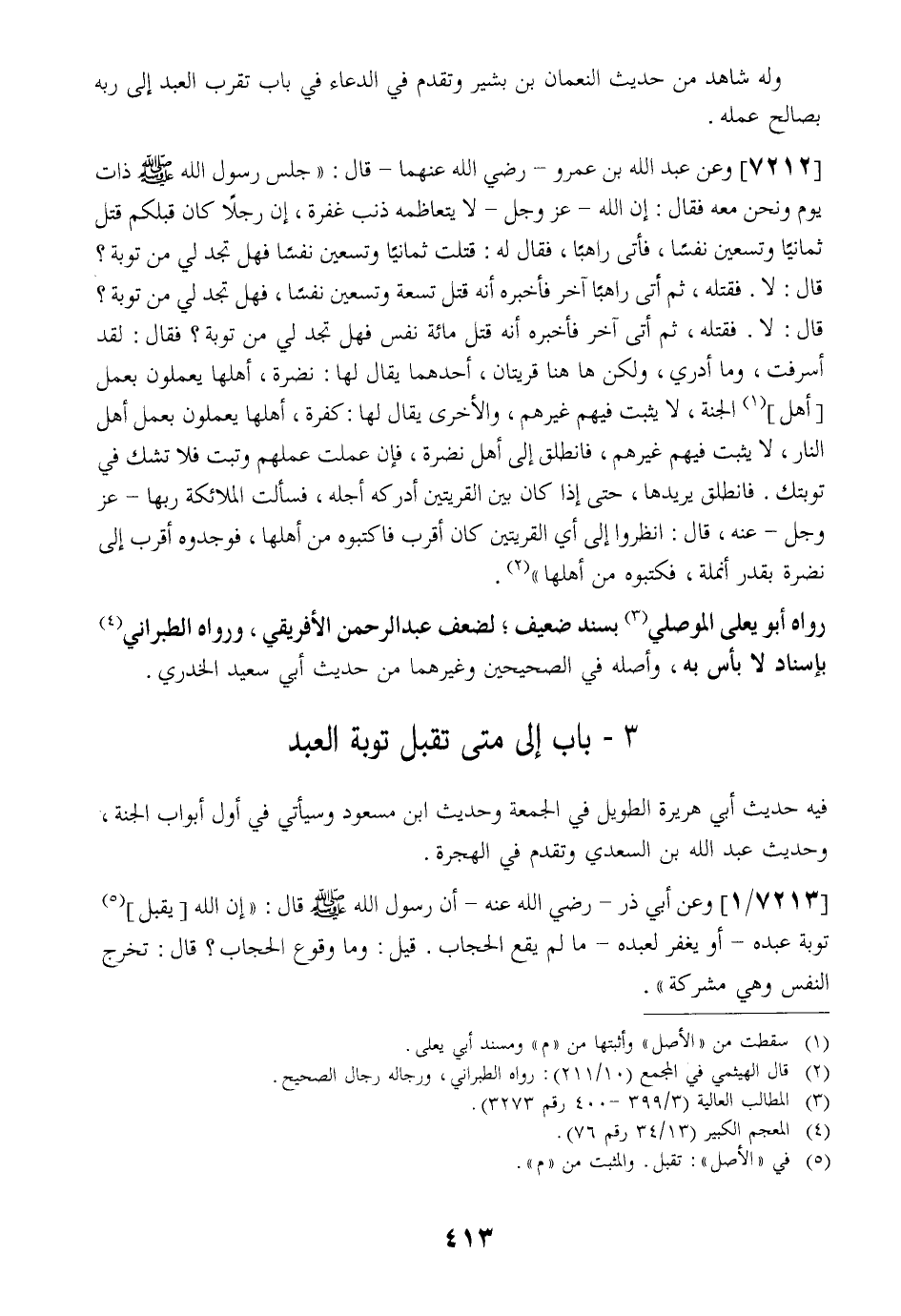 7212 - وَعَنْ عَبْدِ اللَّهِ بْنِ عَمْرٍو- رَضِيَ اللَّهُ عَنْهُمَا- قَالَ: " جَلَسَ رَسُولُ اللَّهِ - صَلَّى اللَّهُ عَلَيْهِ وَسَلَّمَ - ذَاتَ يَوْمٍ وَنَحْنُ مَعَهُ فَقَالَ: إِنَّ اللَّهَ- عَزَّ وَجَلَّ- لَا يَتَعَاظَمُهُ ذَنْبٌ غَفَرَهُ إِنَّ رَجُلًا كان قبلكم قتل ثمانيًا وَتِسْعِينَ نَفْسًا فَأَتَى رَاهِبًا فَقَالَ لَهُ: قَتَلْتُ ثمانيًا وَتِسْعِينَ نَفْسًا فَهَلْ تَجِدُ لِيَ مِنْ تَوْبَةٍ؟ قَالَ: لَا. فَقَتَلَهُ ثُمَّ أَتَى رَاهِبًا آخَرَ فَأَخْبَرَهُ أَنَّهُ قَتَلَ تِسْعَةً وَتِسْعِينَ نَفْسًا فَهَلْ تَجِدُ لِيَ مِنْ تَوْبَةٍ؟ قَالَ: لَا. فَقَتَلَهُ ثُمَّ أَتَى آخَرَ فَأَخْبَرَهُ أَنَّهُ قَتَلَ مِائَةَ نَفْسٍ فَهَلْ تَجِدُ لِيَ مِنْ تَوْبَةٍ؟ فَقَالَ: لقد أسرفت وماأدري ولكن ها هنا قريتان أحدهما يقال لها: نضرة أهلها يعملون بعمل أهل الجنة لا يثبت فيهم غيرهم قال الأخرى يقال لها: كفرة أهلها يعملون بعمل أهل النار لَا يَثْبُتُ فِيهِمْ غَيْرُهُمْ فَانْطَلِقْ إِلَى أَهْلِ نضرة فإن عملت عملهم وتبت فَلَا تَشُكَّ فِي تَوْبَتِكَ. فَانْطَلَقَ يُرِيدُهَا حَتَّى إِذَا كَانَ بَيْنَ الْقَرْيَتَيْنِ أَدْرَكَهُ أَجَلُهُ فَسَأَلَتِ الْمَلَائِكَةُ رَبَّهَا- عَزَّ وَجَلَّ- عَنْهُ قَالَ: انْظُرُوا إِلَى أَيِّ الْقَرْيَتَيْنِ كَانَ أَقْرَبَ فَاكْتُبُوهُ مِنْ أَهْلِهَا فَوَجَدُوهُ أَقْرَبَ إِلَى نَضِرَةَ بِقَدْرِ أُنْمُلَةٍ فَكَتَبُوهُ مِنْ أَهْلِهَا ".