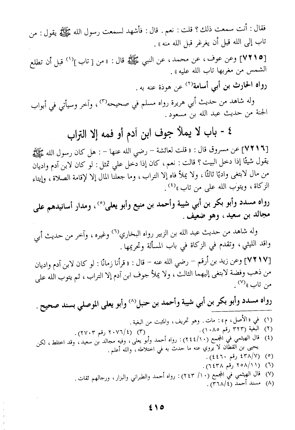 رَوَاهُ مُسَدَّدٌ وَأَبُو بَكْرِ بْنُ أَبِي شَيْبَةَ وَأَحْمَدُ بْنُ حَنْبَلٍ وَأَبُو يَعْلَى الْمَوْصِلِيُّ بِسَنَدٍ صَحِيحٍ.