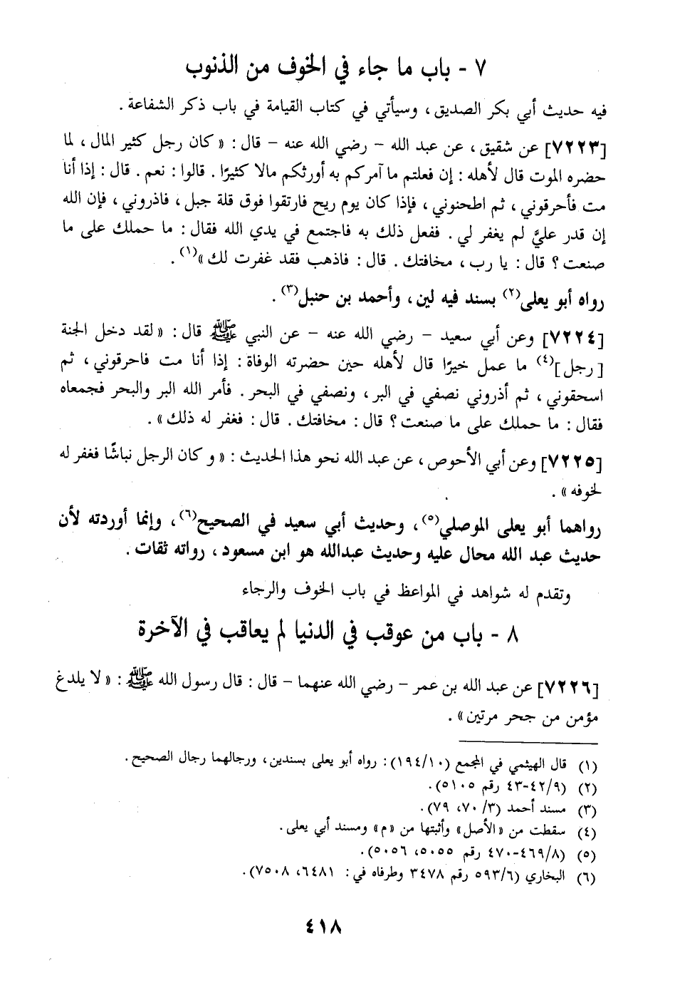 7225 - وَعَنْ أَبِي الْأَحْوَصِ عَنْ عَبْدِ اللَّهِ نَحْوَ هذا الحديث: وكان الرَّجُلُ نَبَّاشًا فَغُفِرَ لَهُ لِخَوْفِهِ ".