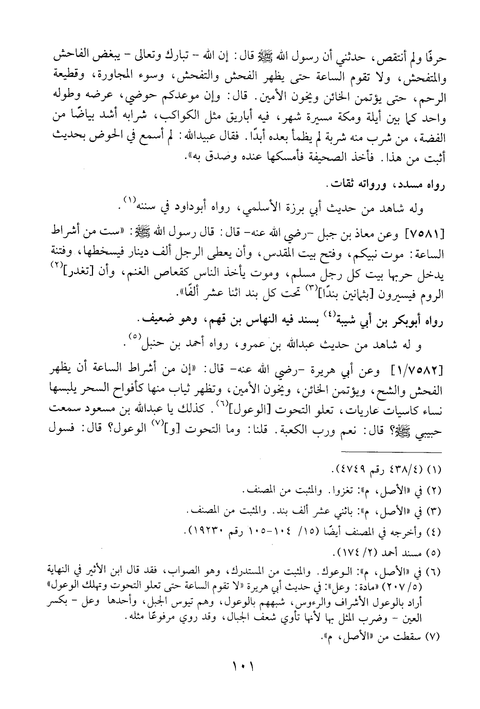 7581 - وَعَنْ مُعَاذِ بْنِ جَبَلٍ- رَضِيَ اللَّهُ عَنْهُ- قَالَ: قَالَ رَسُولُ اللَّهِ - صَلَّى اللَّهُ عَلَيْهِ وَسَلَّمَ -: "سِتٌّ مِنْ أشراط الساعة: موت نبيكم، وفتح بيت المقدس، وأن يعطى الرَّجُلُ أَلْفَ دِينَارٍ فَيَسْخَطُهَا، وِفِتْنَةٌ يَدْخُلُ حَرْبُهَا بَيْتَ كُلِّ رَجُلٍ مُسْلِمٍ، وَمَوْتٌ يَأْخُذُ النَّاسَ كقعاص الغنم، وأن تغدر الروم فيسيرون بثمانين بَنْدًا تَحْتَ كُلِّ بَنْدٍ اثْنَا عَشَرَ أَلفًا".