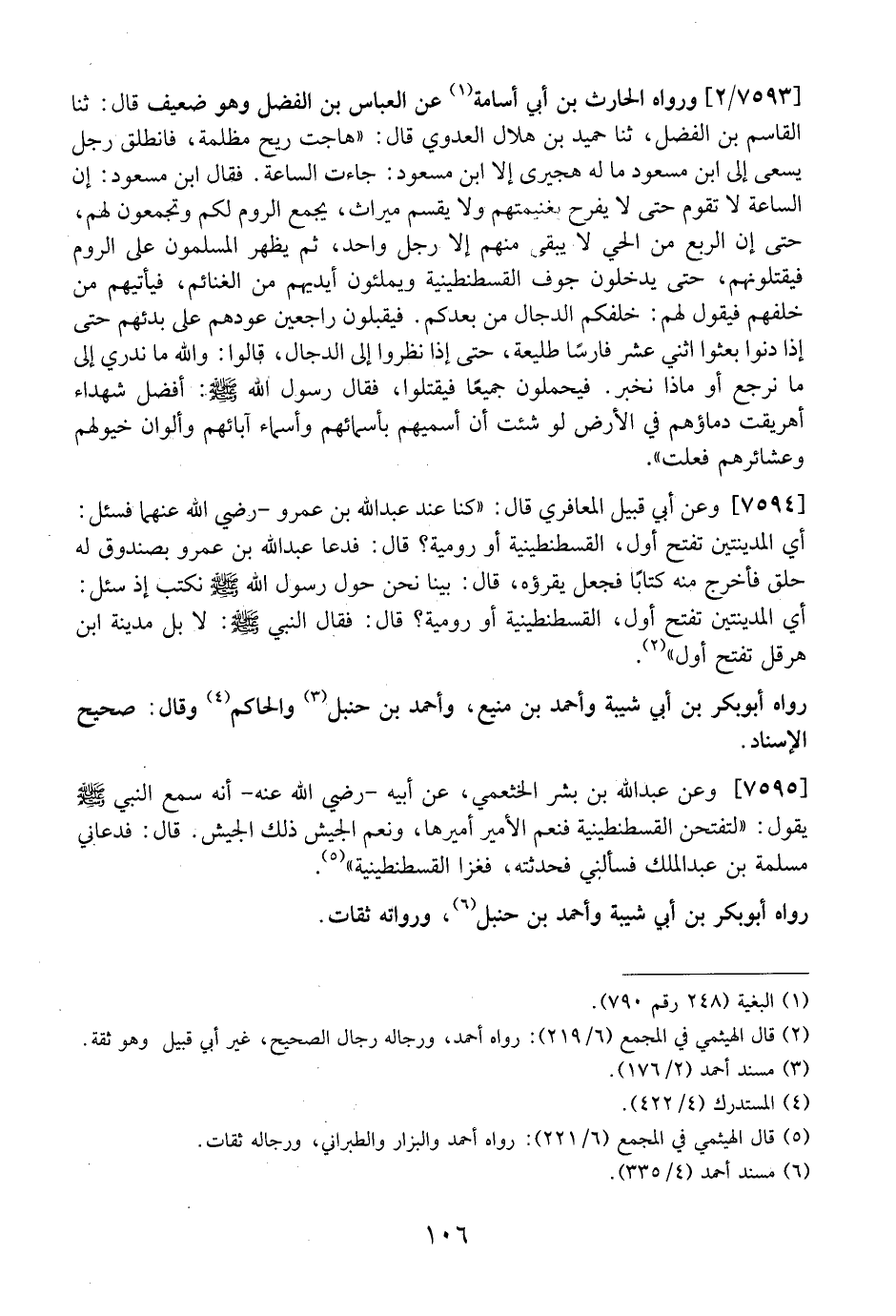 7593 / 2 - وَرَوَاهُ الْحَارِثُ بْنُ أَبِي أُسَامَةَ عَنِ الْعَبَّاسِ بْنِ الْفَضْلِ وَهُوَ ضَعِيفٌ قَالَ: ثَنَا الْقَاسِمُ بْنُ الْفَضْلِ، ثَنَا حُمَيْدُ بْنُ هِلَالٍ الْعَدَوِيُّ قَالَ: "هَاجَتْ رِيحٌ مُظْلِمَةٌ، فَانْطَلَقَ رَجُلٌ يَسْعَى إلى ابن مسعود ما له هجيرى إلّا ابْنَ مَسْعُودٍ: جَاءَتِ السَّاعَةُ. فَقَالَ ابْنُ مَسْعُودٍ: إِنَّ السَّاعَةَ لَا تَقُومُ حَتَّى لَا يُفْرَحَ بِغَنِيمَتِهِمْ وَلَا يُقَسَمَ مِيرَاثٌ، يَجْمَعُ الرُّومُ لَكُمْ وَتَجْمَعُونَ لَهُمْ، حَتَّى إِنَّ الرُّبُعَ مِنَ الْحَيِّ لَا يَبْقَى مِنْهُمْ إِلَّا رَجُلٌ وَاحِدٌ، ثُمَّ يَظْهَرُ الْمُسْلِمُونَ عَلَى الرُّومِ فَيَقْتُلُونَهُمْ، حَتَّى يَدْخُلُونَ جَوْفَ الْقُسْطَنْطِينِيَّةِ وَيَمْلَئُونَ أَيْدِيَهُمْ مِنَ الْغَنَائِمِ، فَيَأْتِيَهُمْ مِنْ خَلْفِهِمْ فَيَقُولُ لَهُمْ: خَلَفَكُمُ الدَّجَّالُ مَنْ بَعْدِكُمْ. فَيُقْبِلُونَ رَاجِعِينَ عَوْدَهُمْ عَلَى بَدْئِهِمْ حَتَّى إِذَا دَنَوْا بَعَثُوا اثْنَيْ عَشَرَ فَارِسًا طَلِيعَةً، حَتَّى إِذَا نَظَرُوا إِلَى الدَّجَّالِ، قَالُوا: وَاللَّهِ مَا نَدْرِي إِلَى مَا نَرْجِعُ أَوْ مَاذَا نُخْبِرُ. فَيَحْمِلُونَ جَمِيعًا فَيُقْتَلُوا، فَقَالَ رَسُولُ اللَّهِ - صَلَّى اللَّهُ عَلَيْهِ وَسَلَّمَ -.: أَفْضَلُ شُهَدَاءَ أهريقت دماؤهم في الأرض لو شئت أدت أُسَمِّيهِمْ بِأَسْمَائِهِمْ وَأَسْمَاءِ آبَائِهِمْ وَأَلْوَانِ خُيُولِهِمْ وَعَشَائِرِهِمْ فَعَلْتُ".